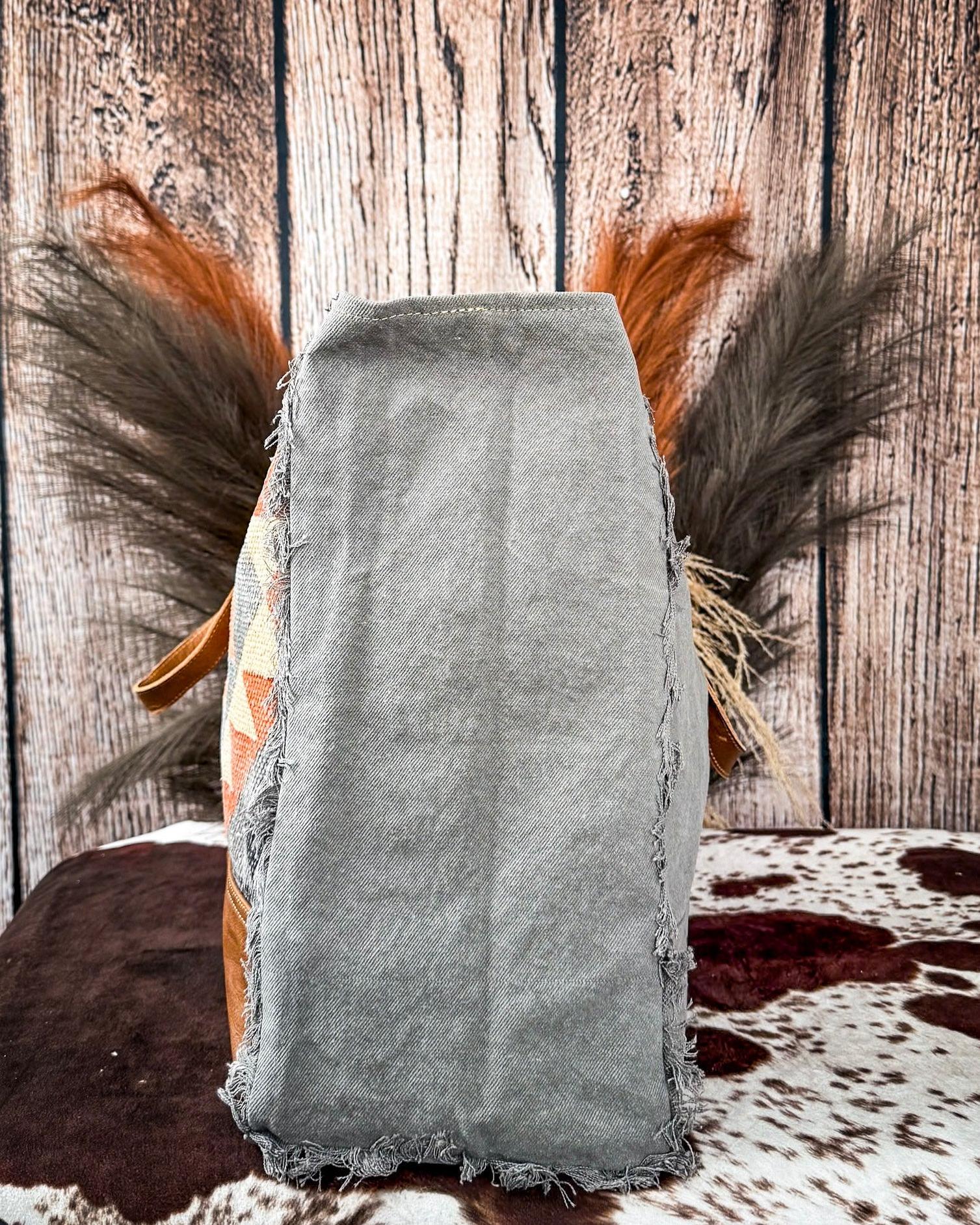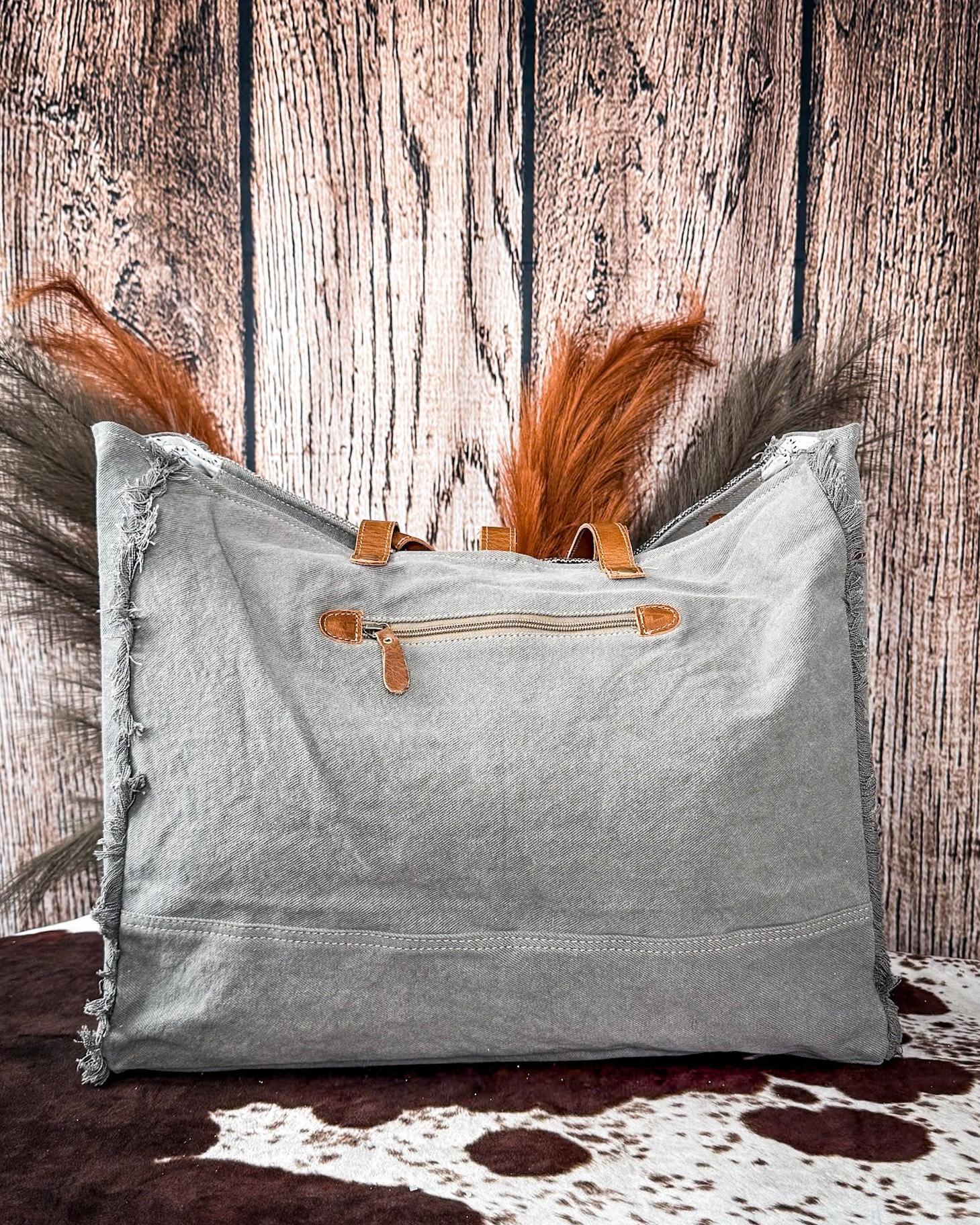 What makes it even better? The back and sides are made from recycled military canvas, giving the bag a vintage, lived-in look and a story all its own. Raw edge fringe along the seams adds a little texture and just the right amount of western grit.