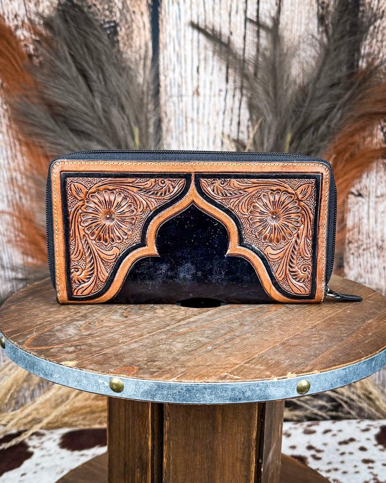 Expertly constructed from genuine leather, this wallet features a striking contrast between rich black leather and hand-tooled caramel-toned panels, forming an ornate, cathedral-inspired pattern. The symmetrical floral tooling on either side of the central curve nods to heritage saddle designs and retro Western motifs, making it a standout accessory for anyone who loves bold structure and artistic detail.