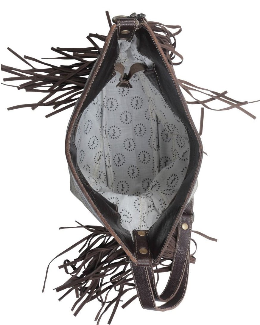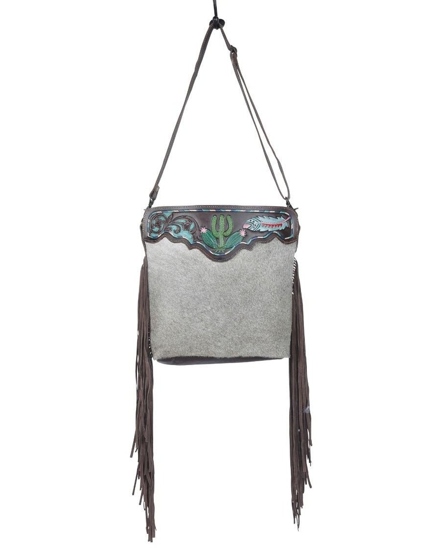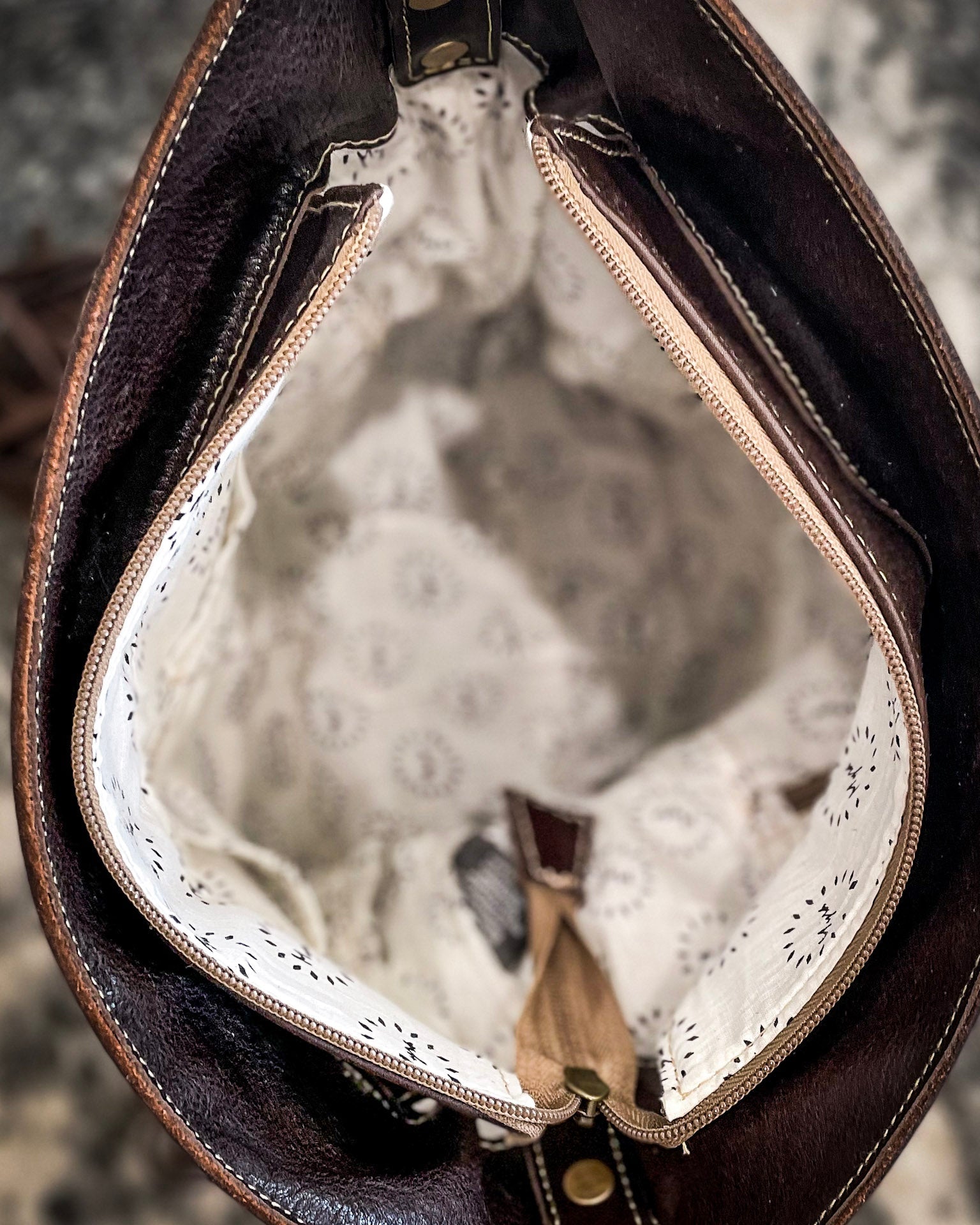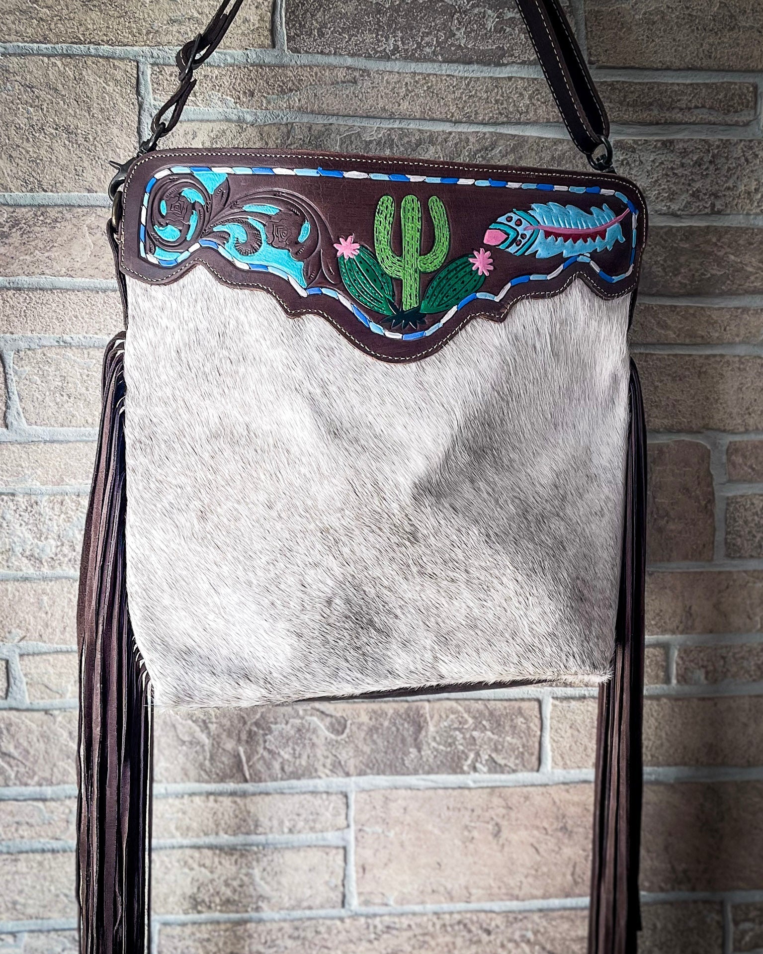The standout feature? That hand-tooled pannel. It's rich with southwestern flair—bright colors, tooled textures, and charming motifs like cacti, feathers, and floral accents, all beautifully painted and stitched. It feels a little vintage, a little modern, and totally unique. Just below, soft hair-on-hide brings a cozy, natural texture that makes each bag one-of-a-kind. The contrast between the two is where the magic really happens.