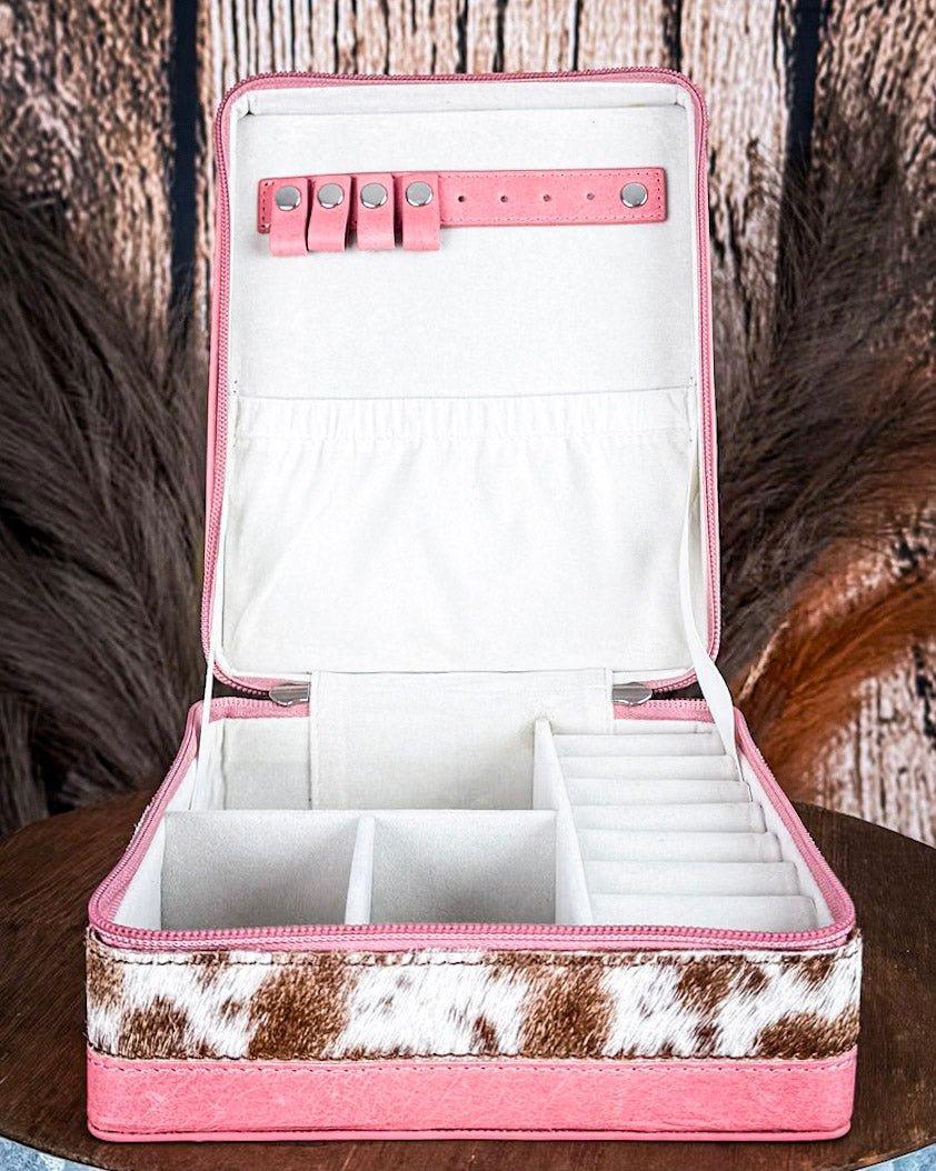 This eye-catching piece is more than just a jewelry box—it’s a statement accessory for your vanity, dresser, or suitcase. Wrapped in a soft sunrise pink leather, this case radiates subtle sophistication with a distinctly feminine Western flair. The top is adorned with a unique hair-on hide accent and a panel of upcycled tribal-inspired rug, blending rustic textures with artistic flair for a look that’s as beautiful as the treasures it holds.