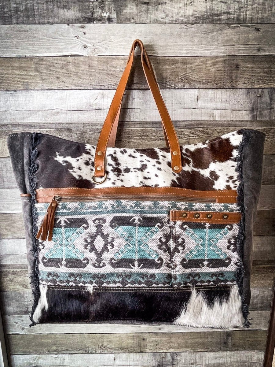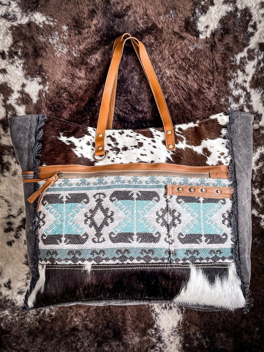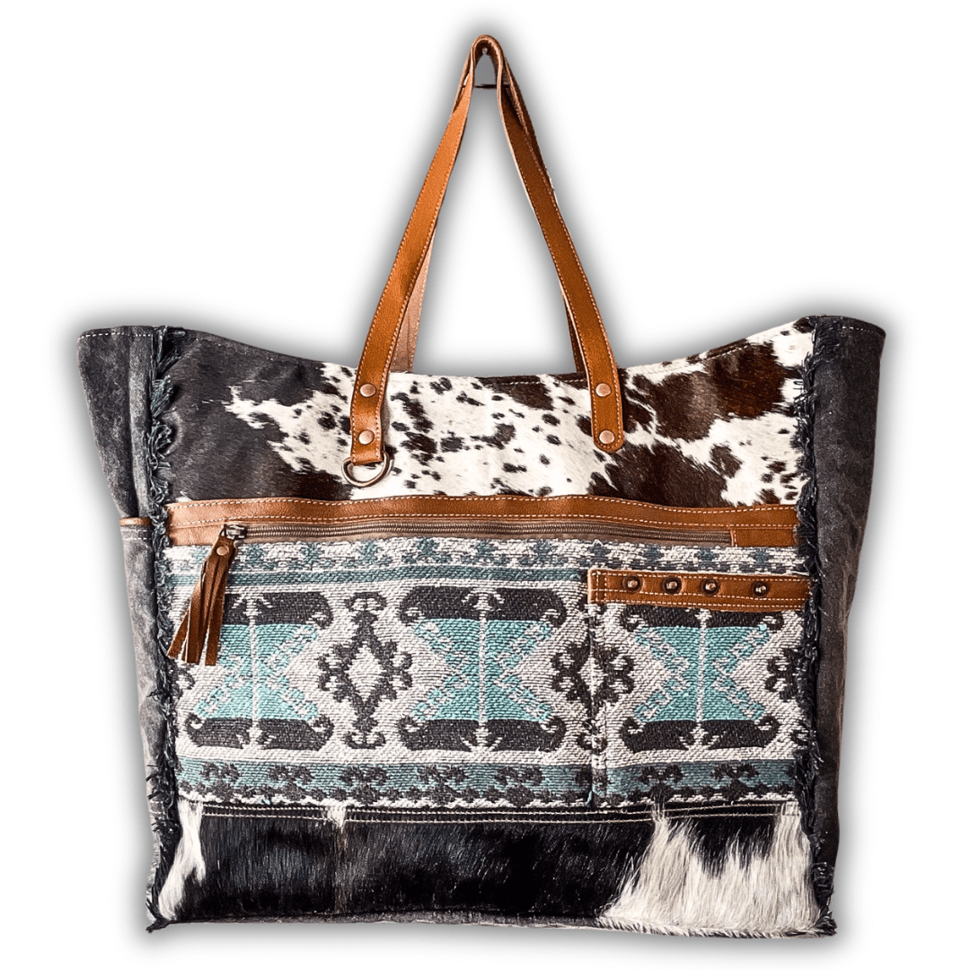 Crafted from a blend of hair-on-hide, leather, and woven canvas, the Isabela June brings together raw beauty and practical structure. The body of the bag features striking patterned canvas in earthy turquoise, charcoal, and cream tones—woven in a design that feels both grounded and vibrant. It’s a true nod to Southwestern soul. Flanked by genuine hide panels and finished with smooth leather handles, this bag doesn’t just carry your essentials—it carries your style with confidence.