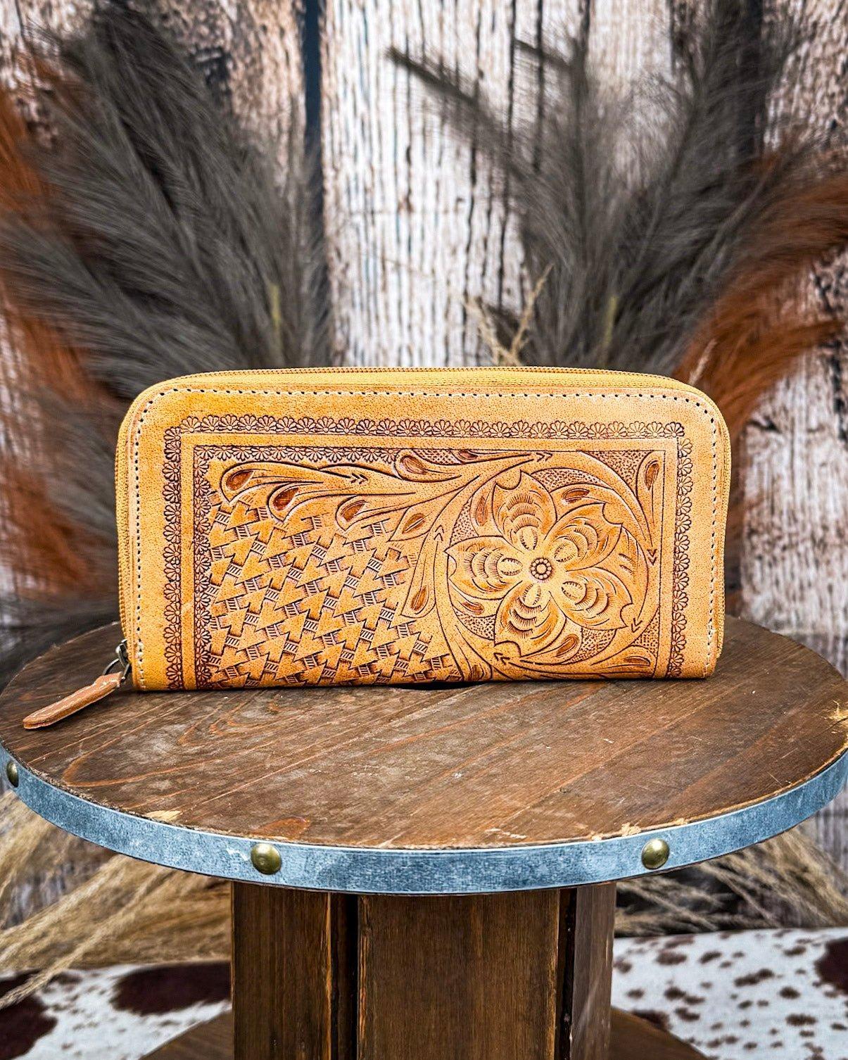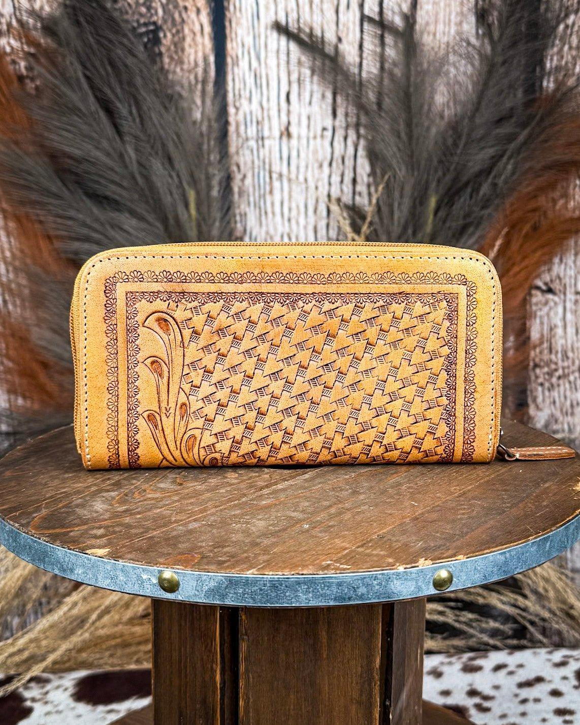 The Moira Wallet is adorned with a hand-tooled floral and basketweave design on rich tan leather that radiates warmth and vintage appeal. Every swirl and texture in the leather tells a story, making this wallet more than just a functional item—it's wearable art.
