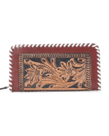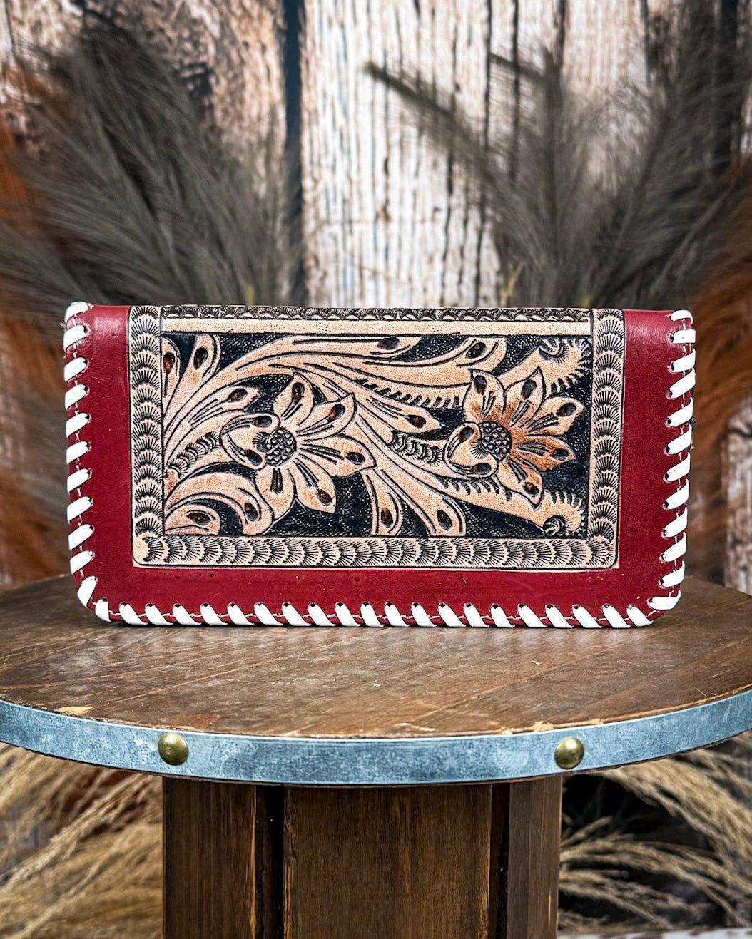 Crafted from genuine leather, the Panoply Wallet stuns with its intricate hand-tooled floral pattern, prominently displayed on the front and back panels. The richly embossed design—set in warm amber and saddle tones—features blooming wildflowers and graceful vines that evoke the essence of a blooming desert sunrise. Framing the artwork is a bold, deep burnt red leather body, enhanced with an eye-catching whipstitch border in contrasting white, giving this wallet a distinctively rugged yet refined finish.