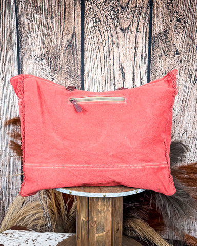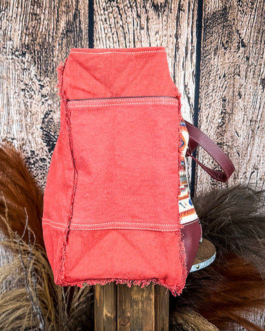 The star of the show? That woven canvas body made from upcycled rug fabric, bursting with rich, rustic tones of terracotta, navy, cream, and gold. It’s vibrant without being loud and perfectly captures that old-school western spirit in a fresh, wearable way. A soft frayed edge trim gives it that worn-in, well-loved feel, while the bold front label detail adds a touch of vintage flair.