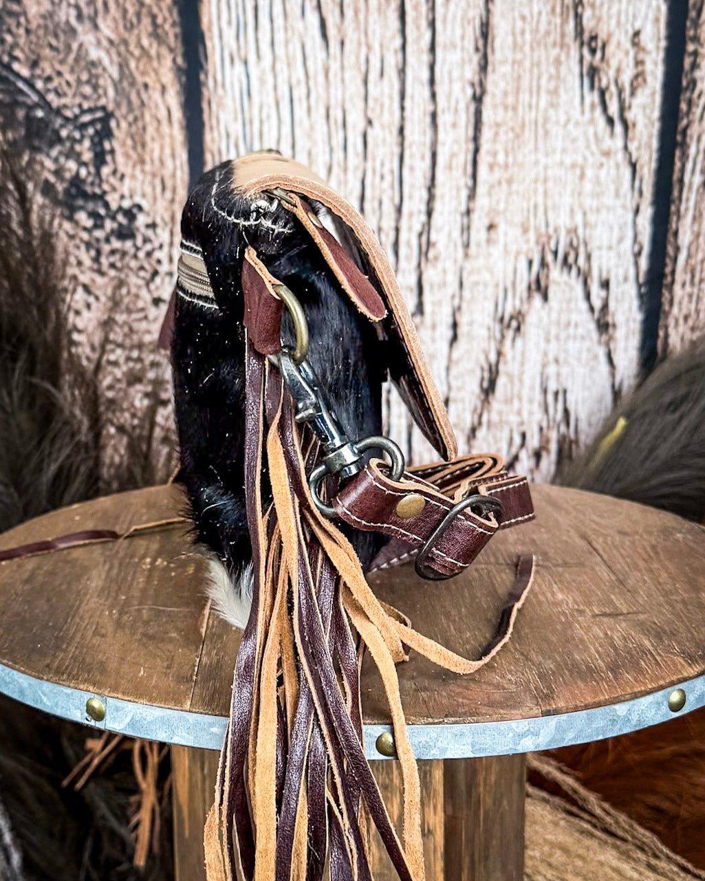 The design is all about texture and contrast. The body is a soft honey-chocolate leather, and the flap features hair-on-hide with a tooled leather accent that brings in that touch of artistry. It's subtle but striking—a look that feels elevated but never overdone. Long side fringe gives it movement and a little wild spirit without overwhelming the look. It swings and sways with every step, adding that hint of personality that turns heads.