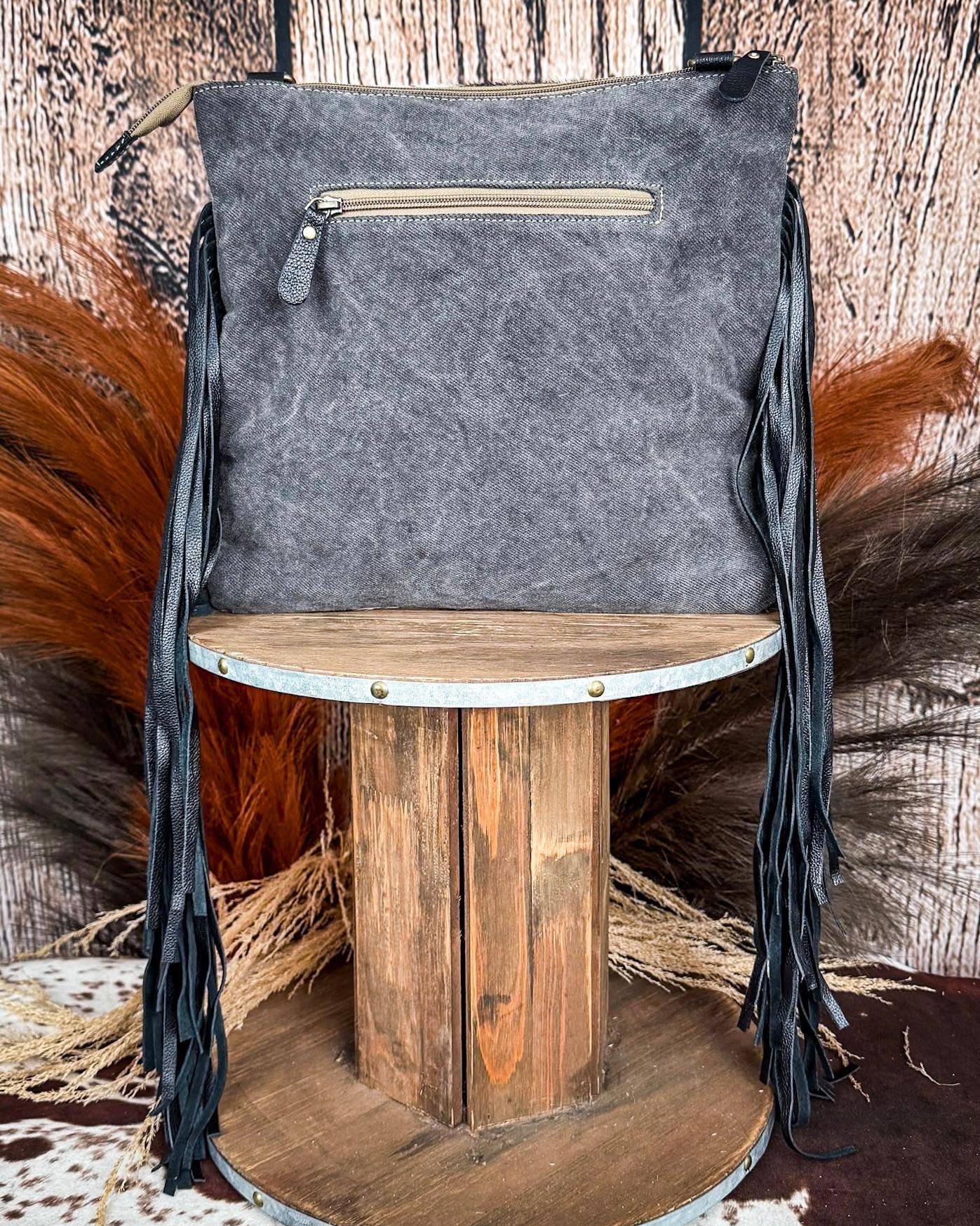 The body of the bag is crafted from hair-on-hide in a striking pattern—rugged and refined all at once. No two bags are the same, thanks to the natural variation in the hide, which makes each piece feel personal and completely unique. Long black fringe down each side gives it movement and edge, adding that extra something that catches the light—and a few compliments along the way.
