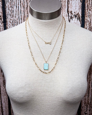 The second layer introduces a radiant burst of color with a rectangular turquoise pendant framed in warm gold. The turquoise stone is rich in tone, with gentle marbling that mimics river paths or cracked desert earth, lending authenticity and character. As a stone often associated with protection and tranquility, turquoise offers more than visual appeal—it carries a legacy of meaning. Cradled in a sleek bezel setting, the pendant hangs from a refined chain that adds just the right amount of sparkle without overpowering the design.