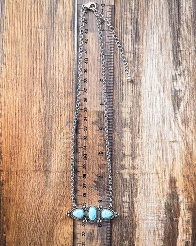 If you love a piece that feels both grounded and eye-catching, the Blue Mesa Necklace is calling your name. With three faux turquoise stones set in antique silver-tone metal, this necklace brings a touch of desert beauty to your everyday look.