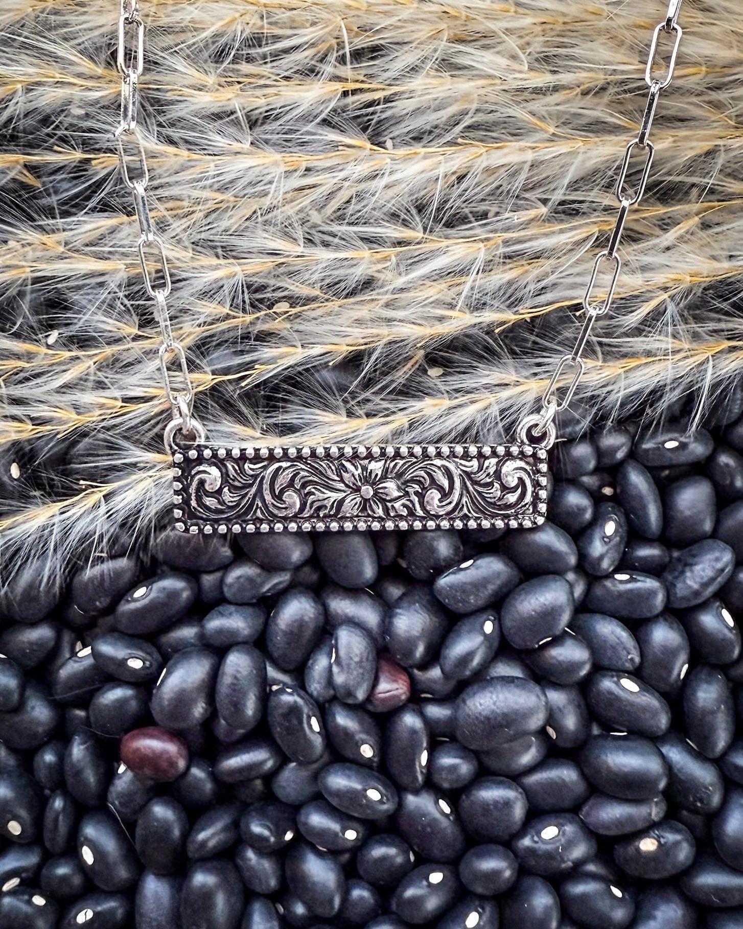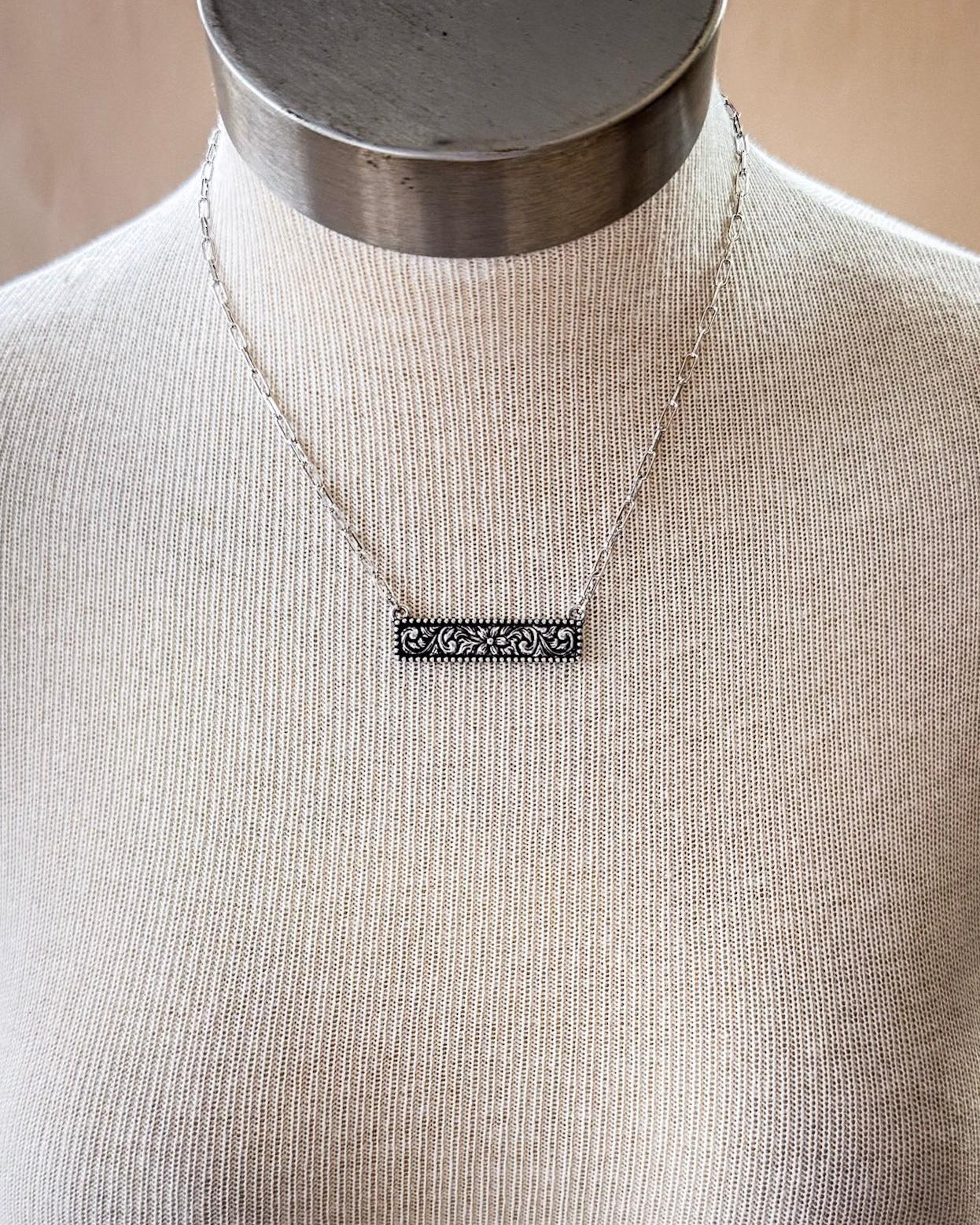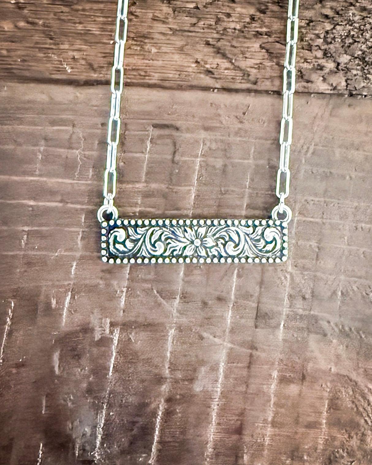 • The Sonny Bar Necklace offers a clean, timeless design with subtle western influence, making it an easy addition to your everyday jewelry rotation. The rectangular silver tone pendant features softly etched detailing that brings texture and interest without overwhelming the simple silhouette. Its polished finish and streamlined shape allow the necklace to pair effortlessly with both casual and elevated looks.