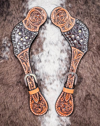 Designed for riders who appreciate both style and substance, this pair features a striking contrast between the warm tooled leather and deep chocolate faux reptile texture. The floral tooling is crisp and clean, flowing across each strap with natural movement. Every detail is thoughtfully placed, from the curves in the leather to the delicate scrolls that frame the edges. It’s western tradition, refined and refreshed.