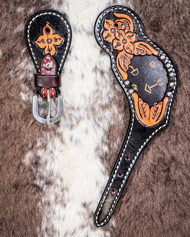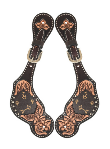 Crafted from rich, dark oil leather, the first thing you’ll notice is the beautiful tooling work. Floral carvings in warm chestnut tones frame the strap design with classic western scrollwork that’s both strong and feminine. The balance of soft floral curves and sharp detail gives these spur straps a confident edge—refined, but never plain.
