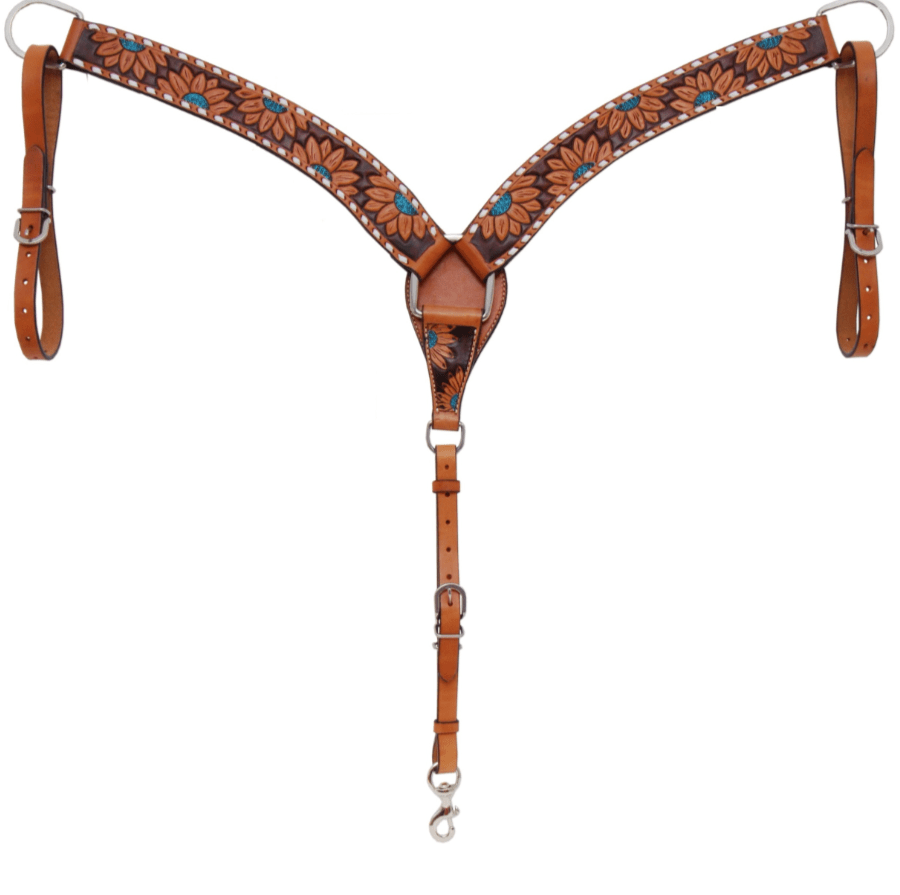 The matching breast collar carries that same sunflower design across the chest, bringing the whole look together without overcomplicating it. It’s balanced, thoughtfully detailed, and designed to lay comfortably across the chest without restricting movement. Every strap is adjustable and built with sturdy hardware that’s ready to ride.