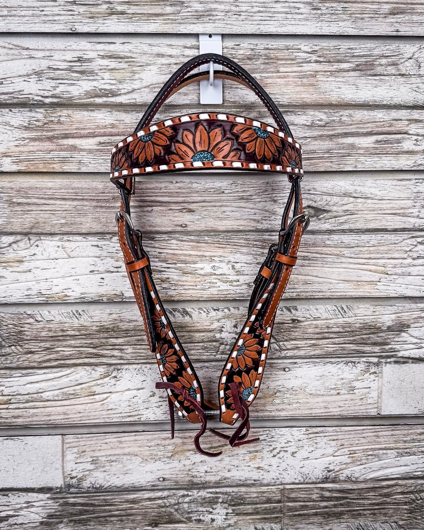 Let’s start with the look. Warm chestnut leather sets the stage for a vibrant sunflower design, finished with pops of turquoise that catch the eye without overpowering. It’s a perfect blend of classic floral style and fresh western flair—rich in color, full of texture, and easy to love. Whether you’re out for a weekend ride or gearing up for a show, this set brings a sense of fun and confidence to any setup.
