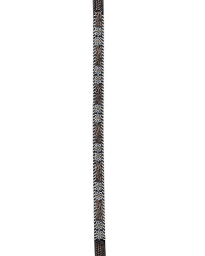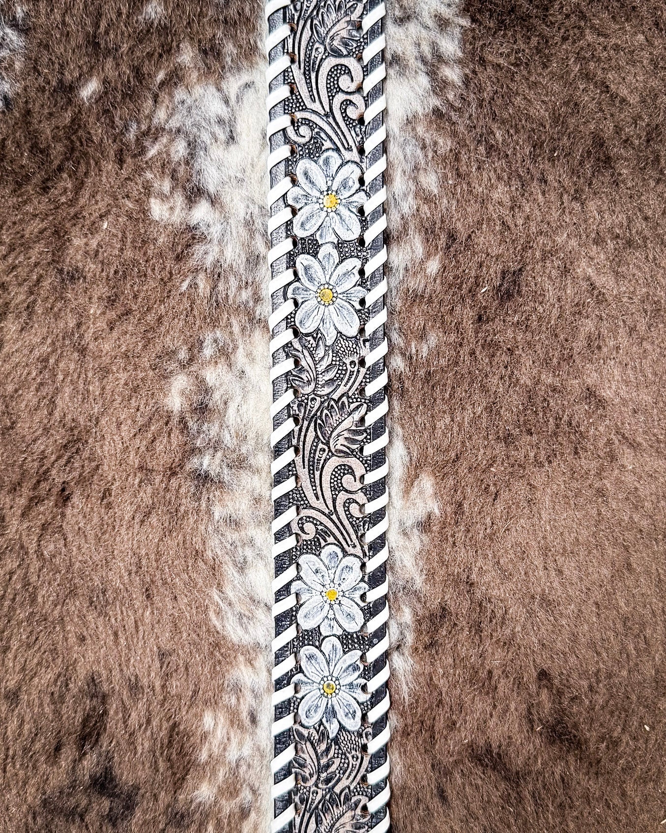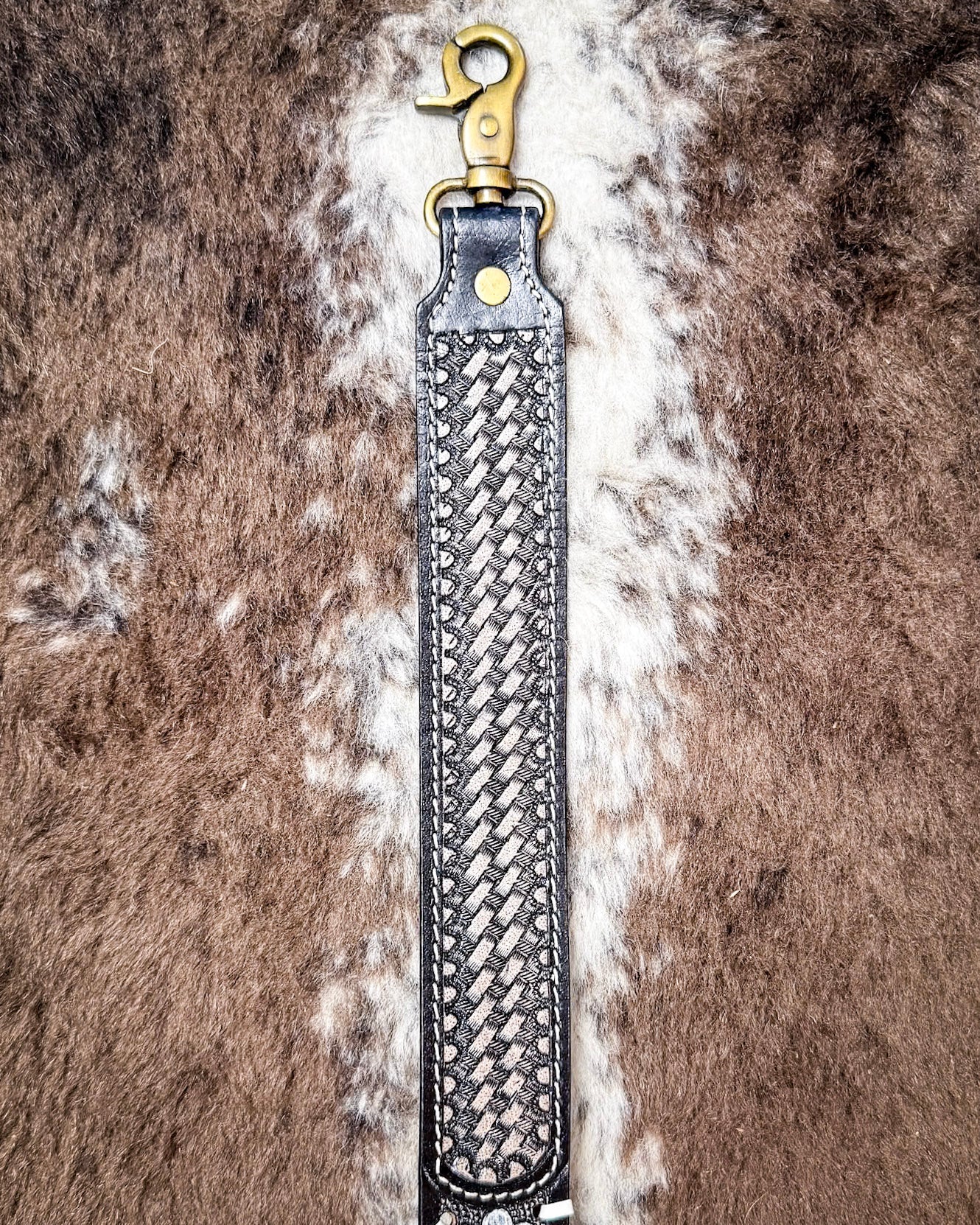 At a glance, this strap balances subtle elegance with bold artisan design. The light tan leather base serves as a warm canvas for the central band of flowing swirl tooling and delicate white floral accents, adding a soft, feminine touch. Each end of the strap is finished with basketweave-style tooling in antique black, offering rich texture and contrast that elevates the overall design. The muted palette makes it incredibly easy to pair with a wide range of bag styles and colors—from neutrals and earth tones to bolder shades.