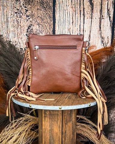 Crafted by Sixtease Bags, this hair-on hide crossbody is a warm blend of texture, tradition, and modern western style. With soft fringe, tooled leather detail, and a rich contrast hide that’s totally one-of-a-kind, the Lariat brings a quiet confidence to every outfit. She’s not flashy, just unforgettable.