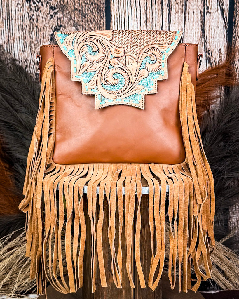 Made by Sixtease Bags, Sunny Jo is all about contrast and character. That eye-catching flap features intricate vine and basket tooling with a turquoise inlay that pops against the warm, saddle-brown leather. The playful stepped edge adds movement and charm, while the fringe keeps things fun and free-spirited.