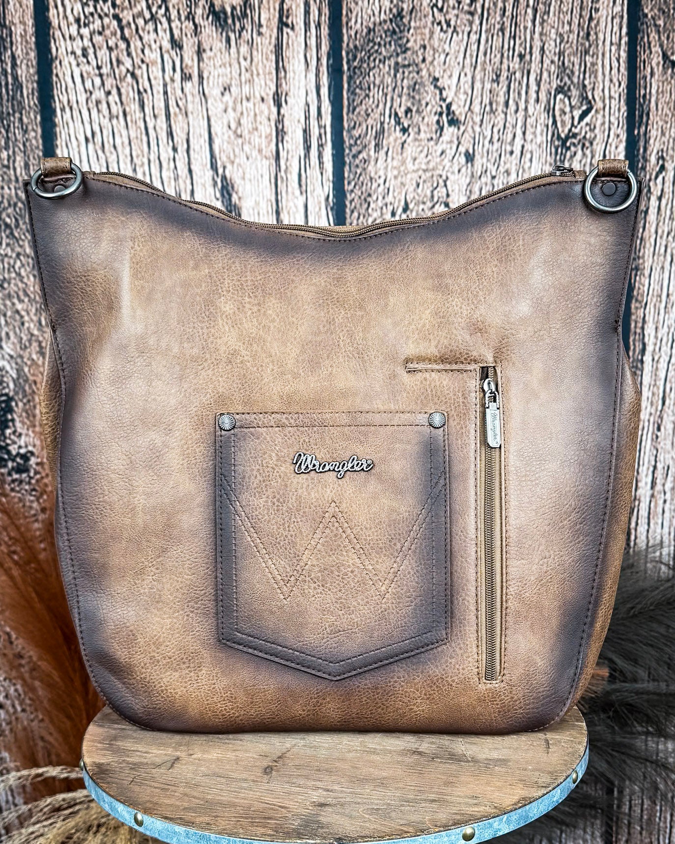 Carry western style with confidence with the Wrangler Ava Concealed Carry Tooled Shoulder Bag, built for modern cowgirls who need form and function. Featuring a distressed brown vegan leather exterior, this everyday bag is highlighted by Wrangler’s signature “W” stitch pocket detail and a hand-tooled shoulder strap that adds rugged character. A concealed carry compartment offers secure and discreet access, making it a practical option for women on the go.