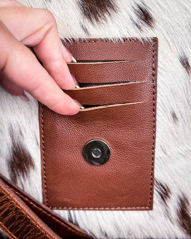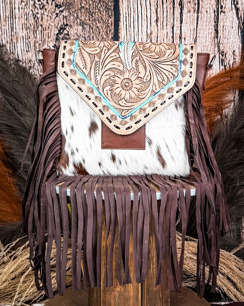 Crafted by Sixtease Bags, this hair-on hide crossbody blends wild western soul with bold, boutique edge. The flap is finished in intricately tooled leather, featuring a feather design that adds depth and meaning—freedom, movement, and strength carved right into the leather. Paired with natural hide and dramatic fringe, Straybird is a piece that feels both grounded and untamed.