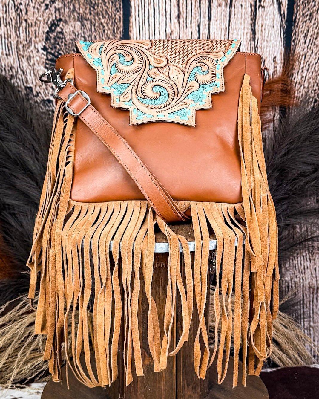 Made by Sixtease Bags, Sunny Jo is all about contrast and character. That eye-catching flap features intricate vine and basket tooling with a turquoise inlay that pops against the warm, saddle-brown leather. The playful stepped edge adds movement and charm, while the fringe keeps things fun and free-spirited.