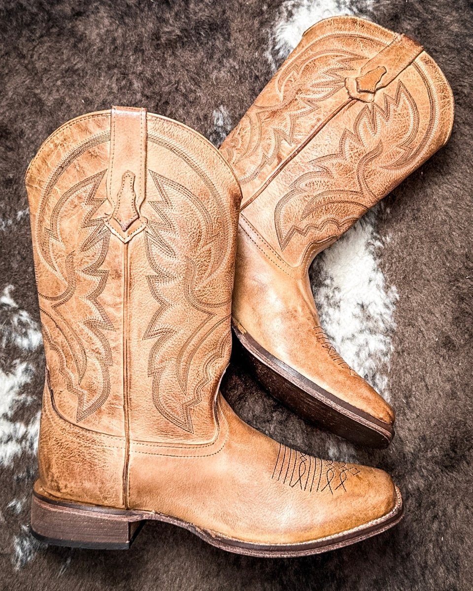Step out in classic western style with the Lindsey Burnished Leather Boots in Tan by Roper. These beautifully crafted boots feature a burnished tan leather finish and traditional western stitching for an authentic, time-worn look. Built for comfort and durability, they include a padded insole, moisture-wicking lining, and a sturdy rubber sole—perfect for all-day wear from the ranch to the dance floor.
