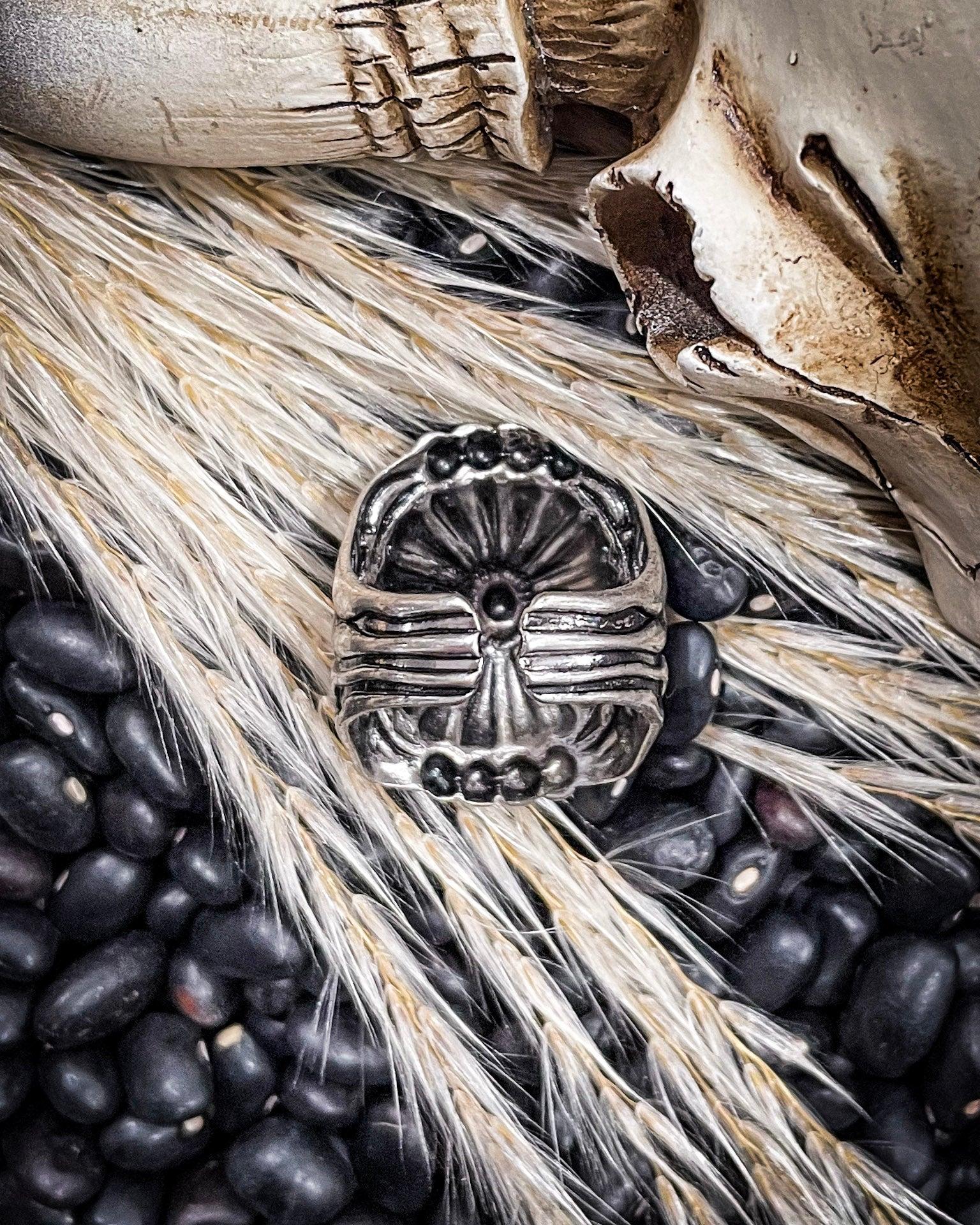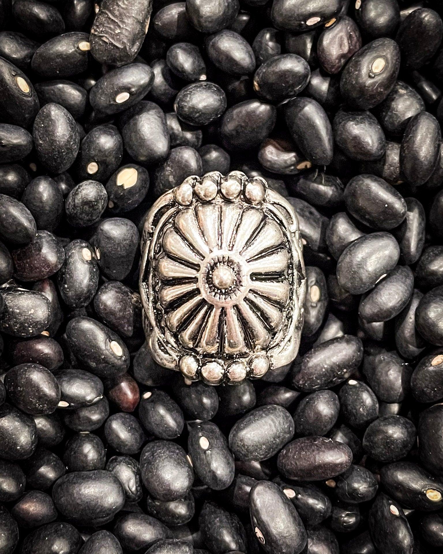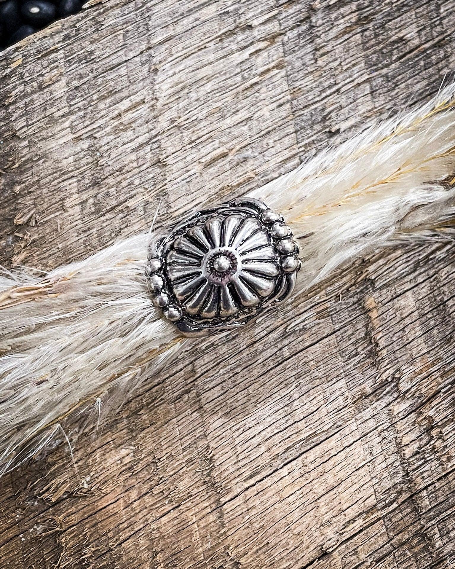 Crafted from high-quality, antiqued silver-tone metal, this ring features a bold concho centerpiece with sunburst-style engraving radiating from a tiny center blossom. Raised dotted edging wraps around the top and bottom like a nod to old-school silverwork, giving it just enough texture and dimension to catch the light (and a few compliments). It’s a statement, sure—but not the loud kind. More like the kind that makes someone pause and say, “Where’d you get that?”