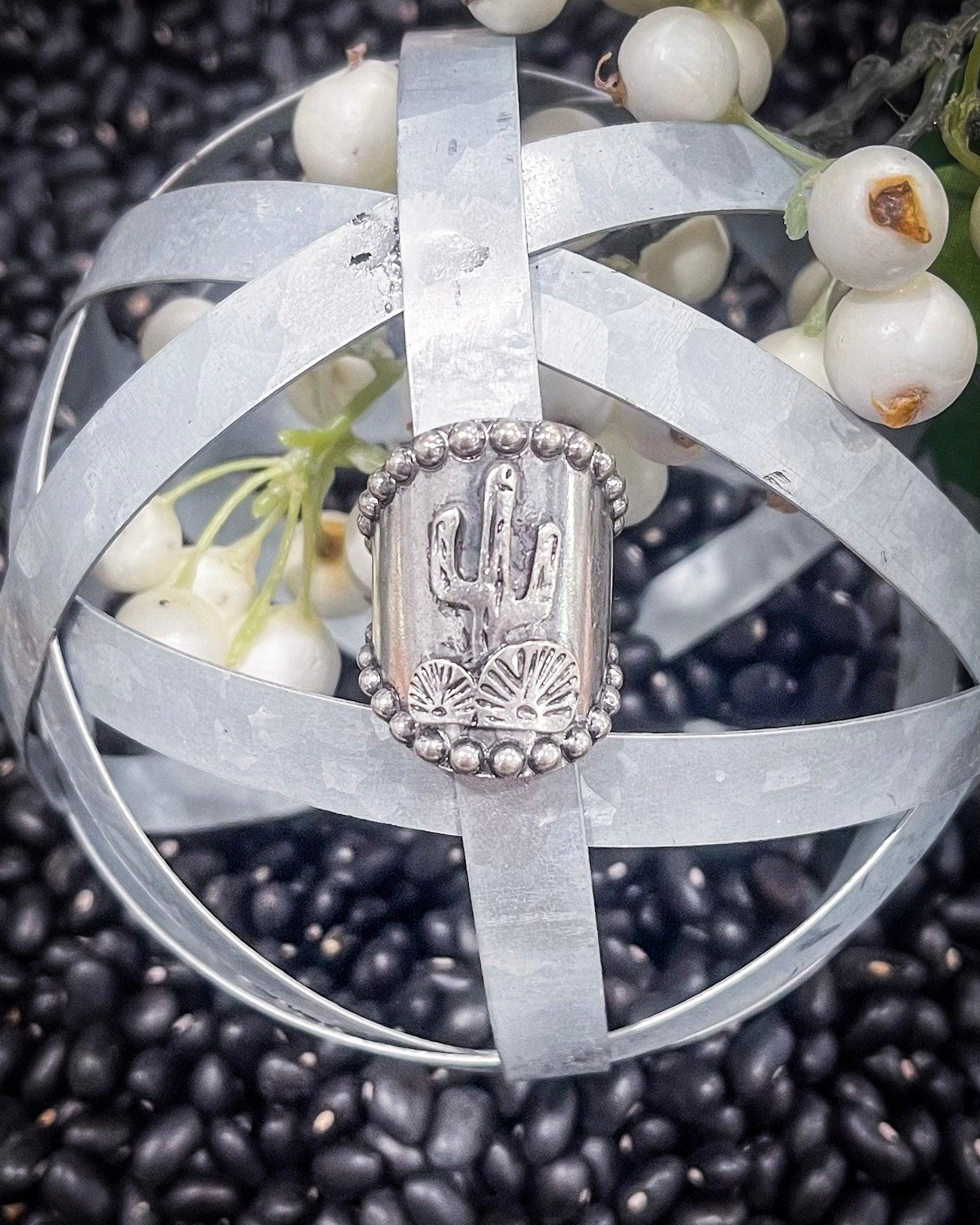 Front and center is a stamped cactus design framed with delicate beading and desert-inspired motifs that give it that true frontier feel. It’s the kind of detail that feels timeless—rooted in western tradition, but easy to wear every day. The wide band and cuff-style shape give it a bold silhouette, but don’t worry—it’s surprisingly comfy thanks to its open back and lightweight build. It’s an OSFA (one size fits all) fit, which means it flexes just enough to slide on easily and adjust to your finger without pinching or fussing.