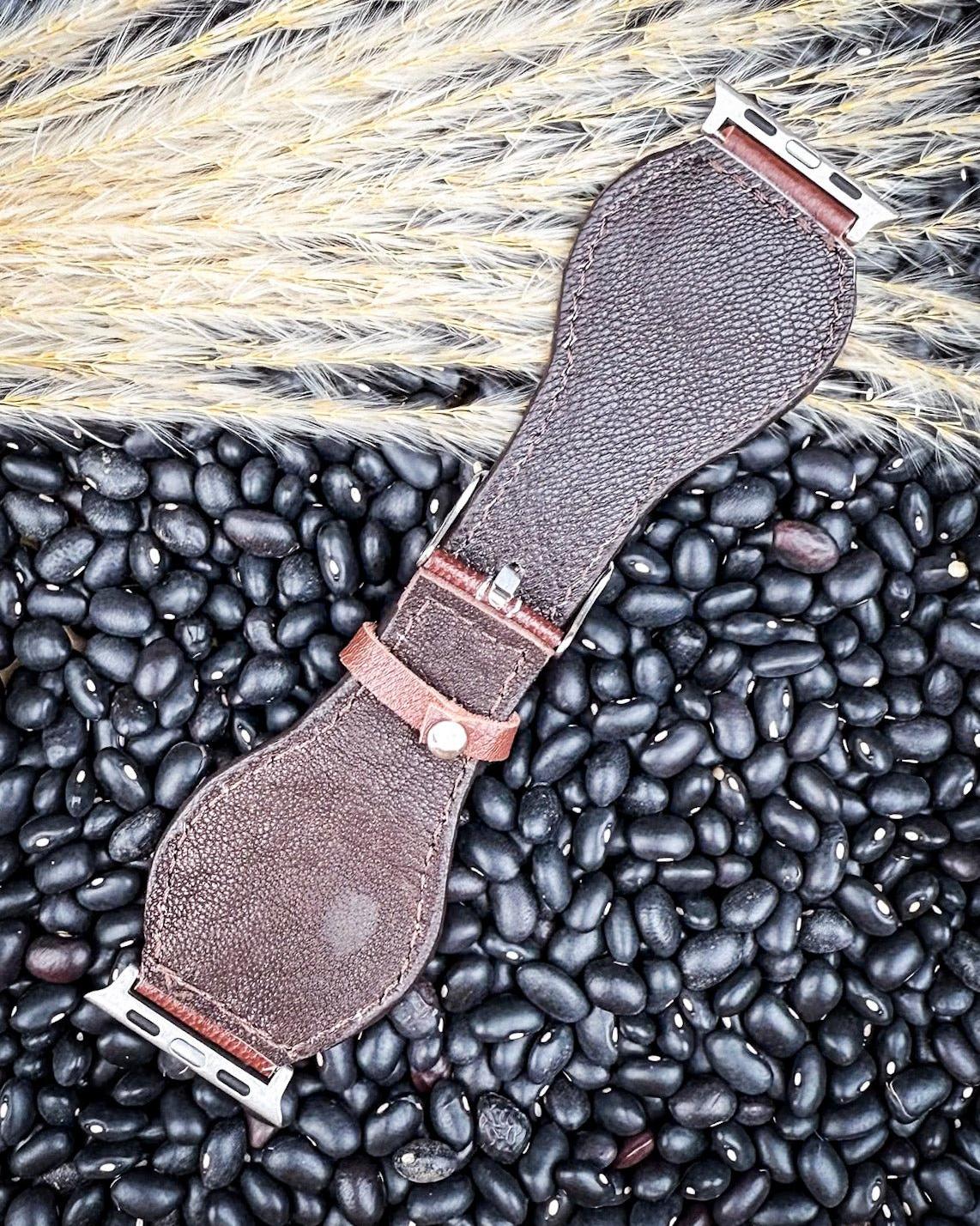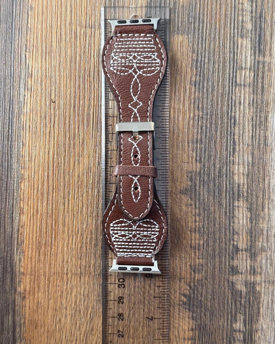 Crafted from genuine leather and designed with care, this Apple Watch band is anything but basic. The brown leather is smooth and structured, with just enough give to break in and age beautifully over time. It’s stitched in a pattern that nods to traditional western boot designs—sharp lines, curved edges, and a story woven through every detail. It’s the kind of piece that feels worn-in from the start and only gets better with time.