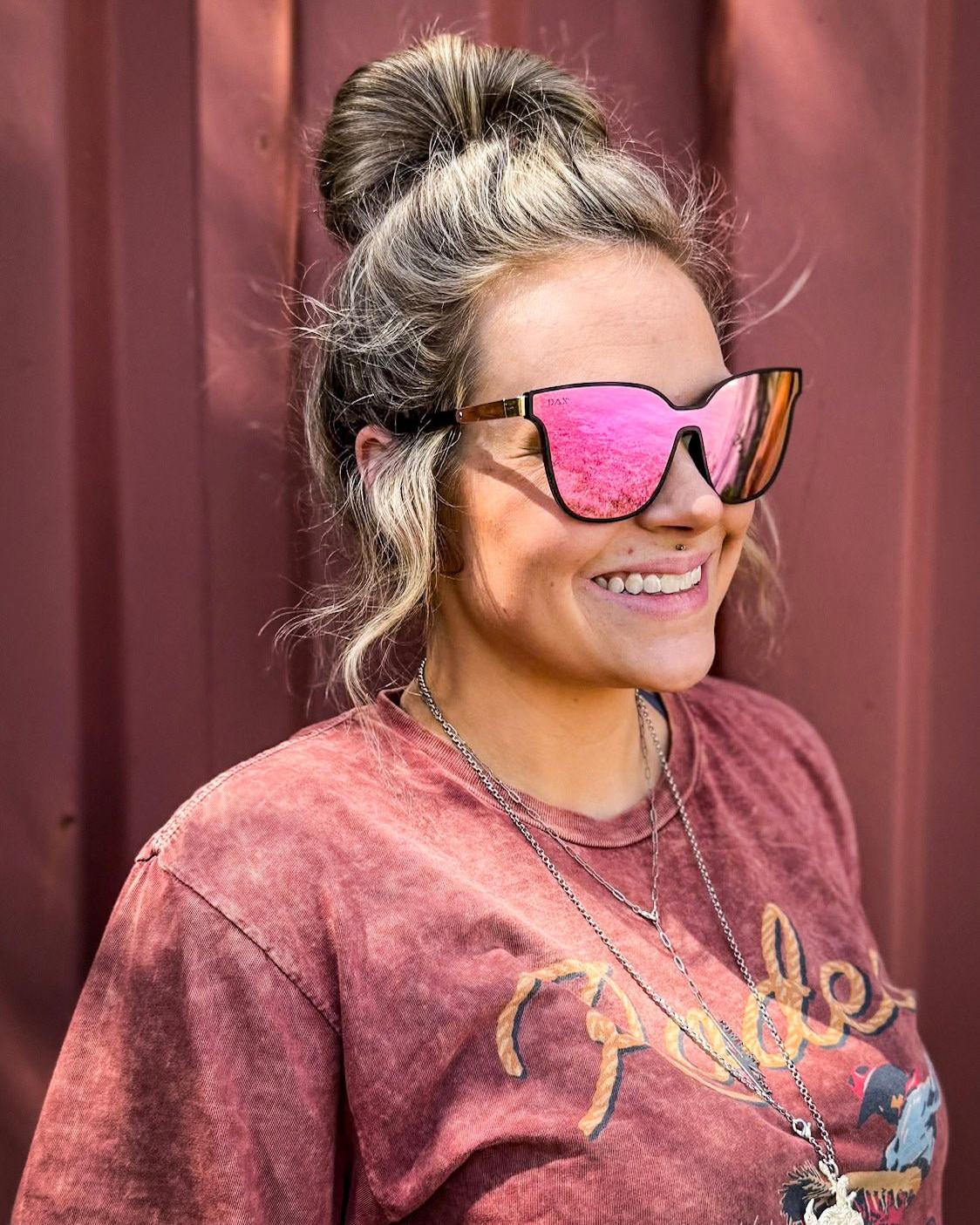 With three vibrant styles to choose from—Hot Pink, Blue, and Flame—you can switch it up or stick to your signature vibe. The Hot Pink option pairs a sleek black frame with a poppin’ pink mirror lens that dances between shades of fuchsia and violet, catching the light in the best way. Blue brings a cool, ocean-inspired vibe with its clear frame and dreamy blue mirrored lens. And Flame? She’s got that dusty pink frame and fiery orange lens that turns heads without trying too hard. Each one brings its own kind of heat.