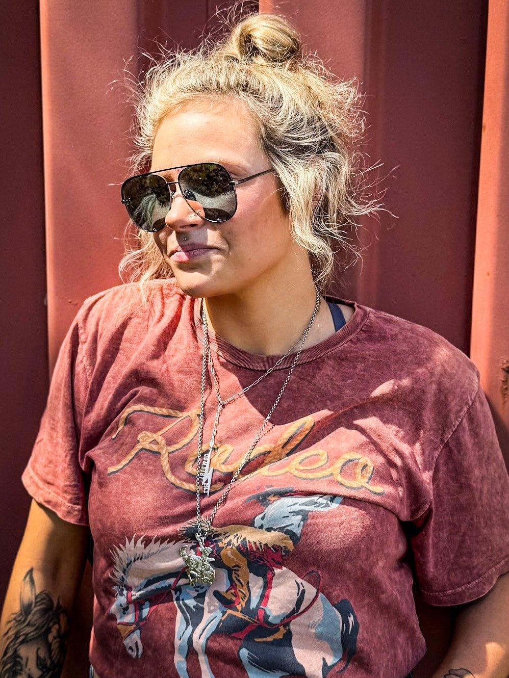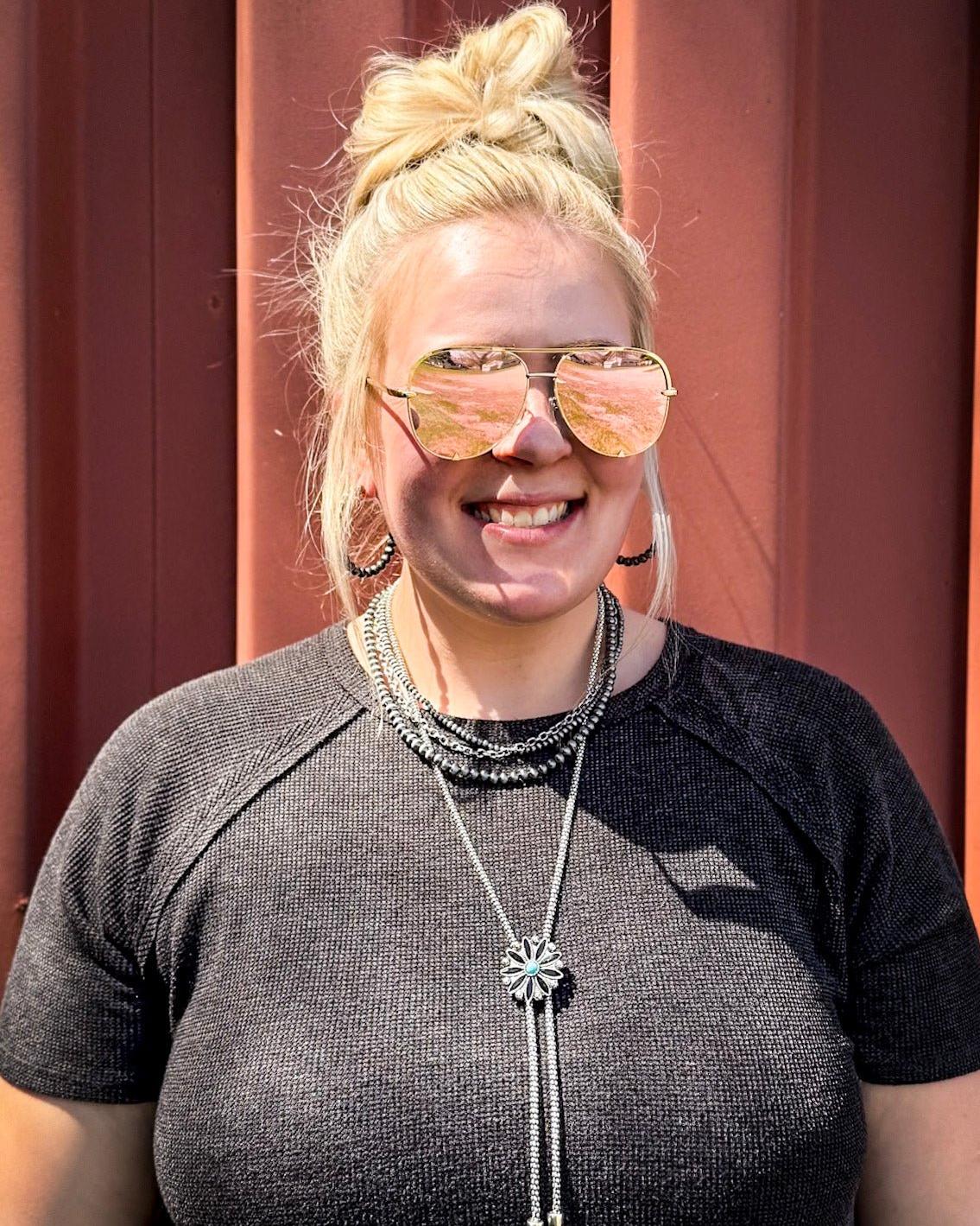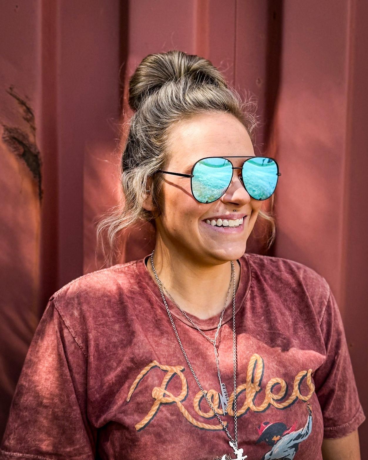 Built for everyday wear but tough enough for barn days, these aviators blend sleek lines with just enough western grit to feel right at home in your feedlot boots or your going-out ‘fit. The metal frame is lightweight but sturdy, with a fit that stays comfortable from sun-up to sundown. And with a variety of lens colors to choose from—like bold blue, golden ombré, or soft rose pink—you can pick your vibe and wear it proud.