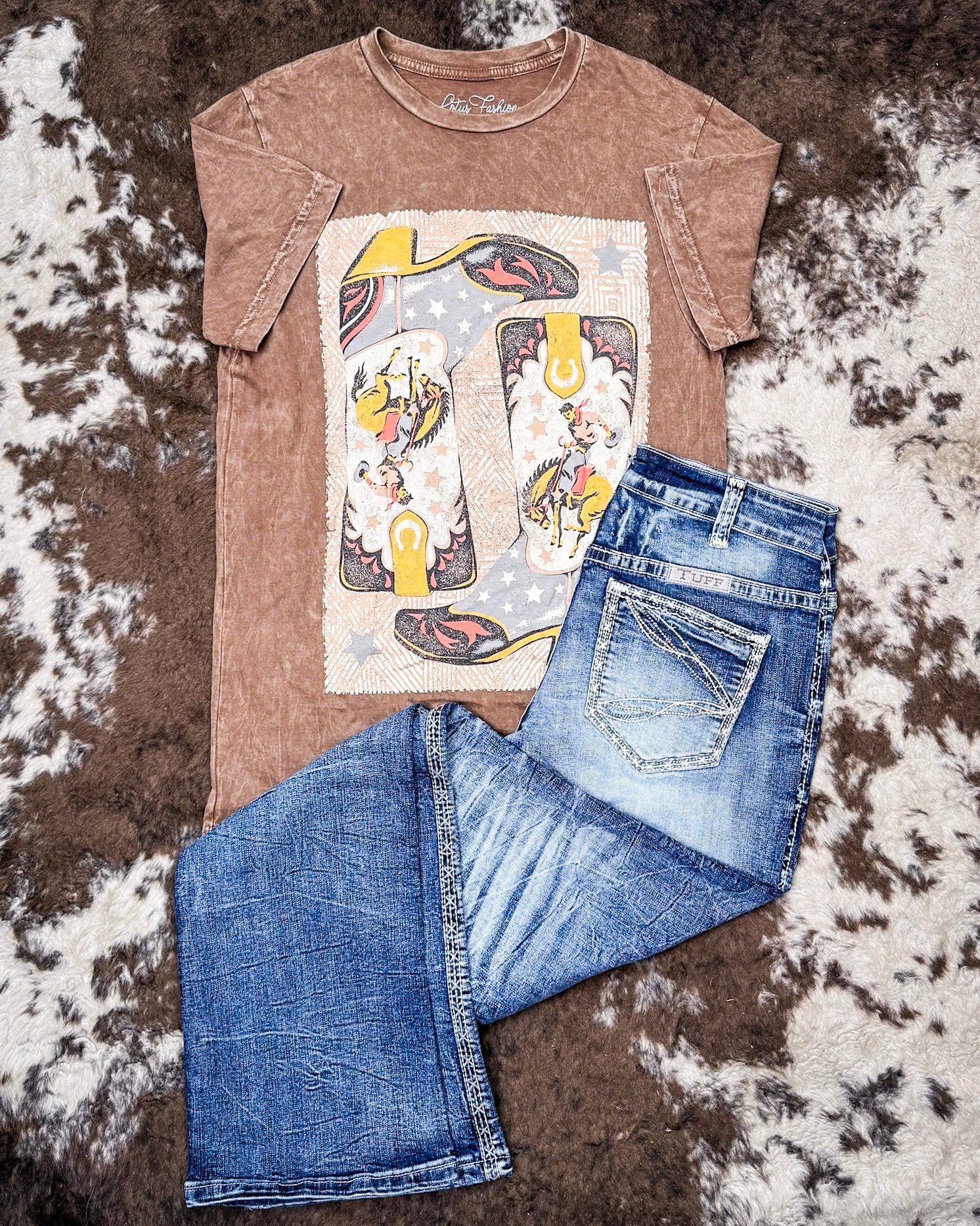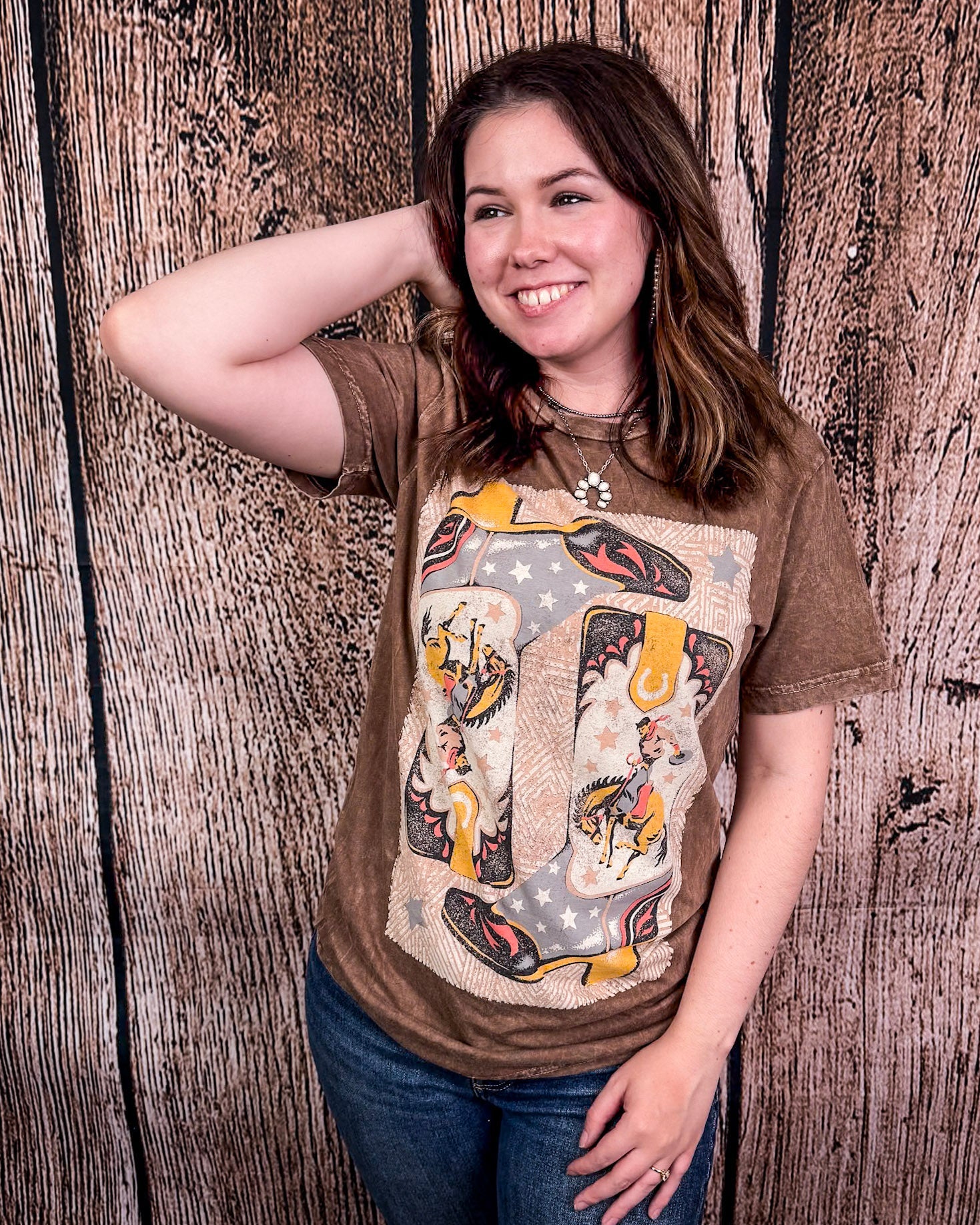 The Boots and Glory Graphic Tee brings all the retro rodeo charm with a modern western twist. Featuring a bold graphic of tall cowgirl boots decked out with bronc riders, horseshoes, stars, and a little attitude—it’s a wearable nod to the women who show up and show out.