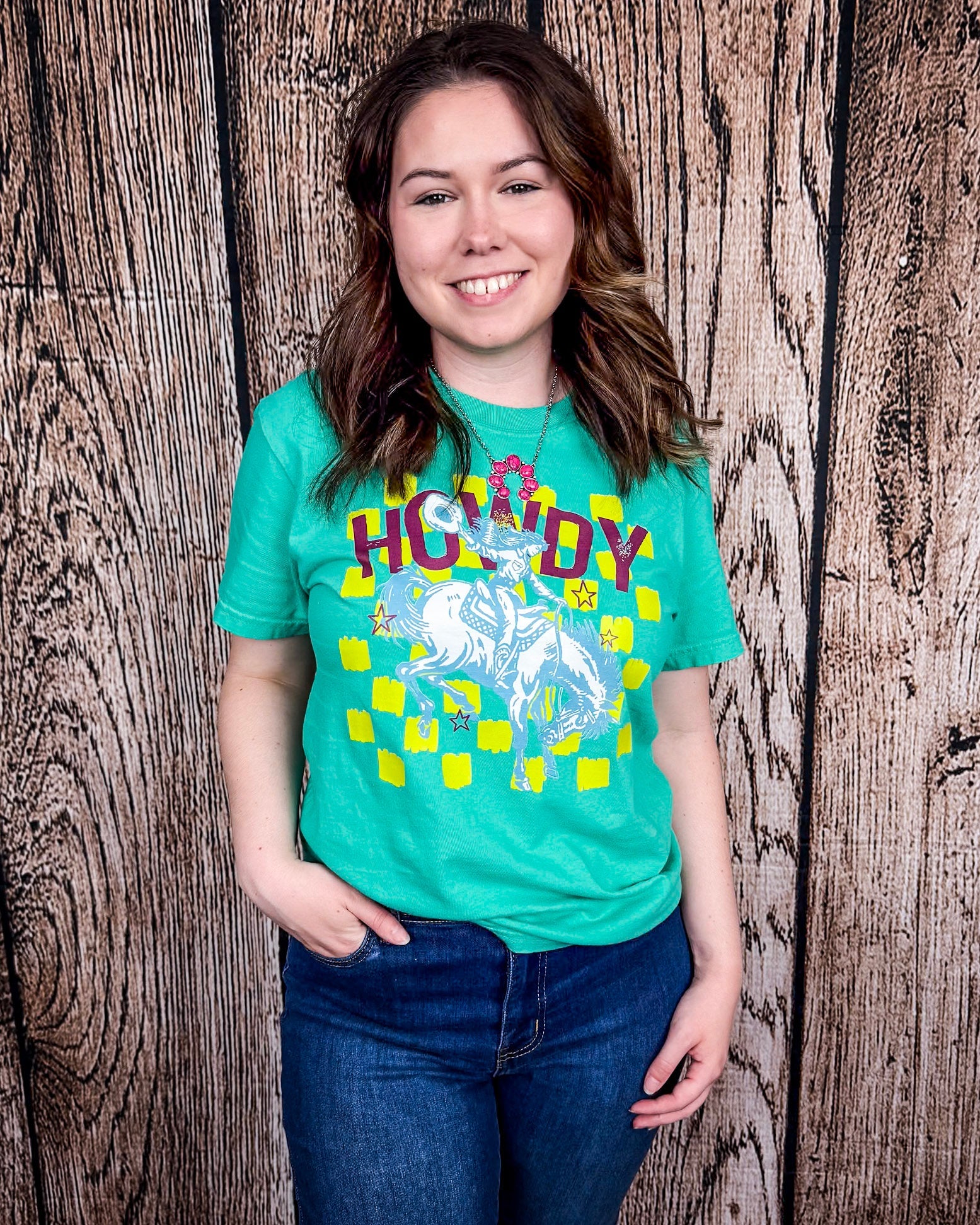 Say hello to your new favorite graphic tee—bold, punchy, and made to turn heads. The Buckin Babe Howdy Tee brings all the attitude of a rowdy rodeo night with a playful pop of color that doesn’t hold back. That rich island green? It’s the kind of shade that makes any outfit feel fresh and fearless. And that graphic? Pure electric energy. A high-kickin’ bronc, a fierce rider, and a whole lotta western sass, stamped right across the chest with a big, bright HOWDY.