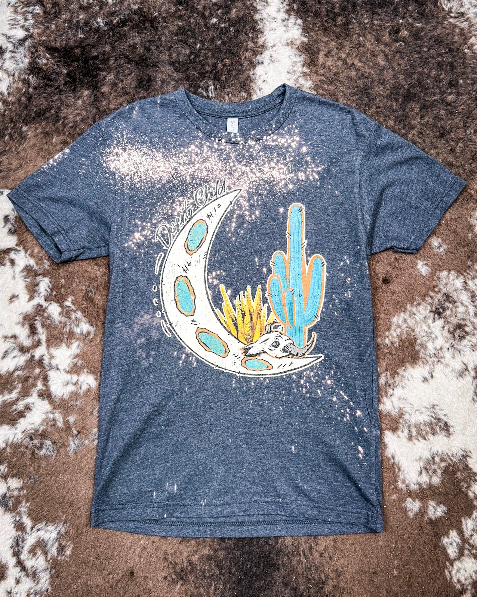 The front graphic features a crescent moon, a bright desert bloom, a saguaro cactus, and a longhorn skull—all set against a charcoal black base with hand-bleached accents. The words “Desert Child” arch along the top, adding that little extra touch of wanderlust. Whether you're drawn to desert landscapes or just love a bold graphic with western roots, this tee brings that energy front and center.