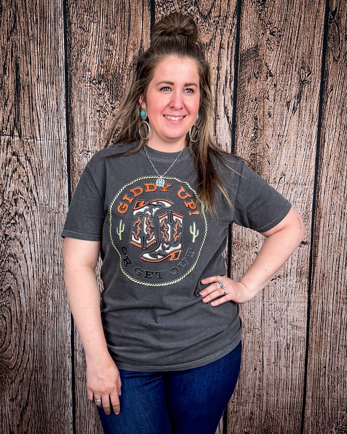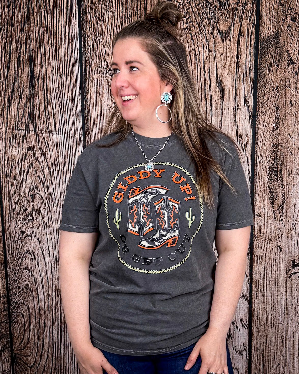 The Giddy Up or Get Out tee is for the ones who don’t wait around. For the bold, the loud-laughers, and the go-getters who show up as they are. It’s vintage in spirit, modern in comfort, and made to move through whatever the day throws your way.