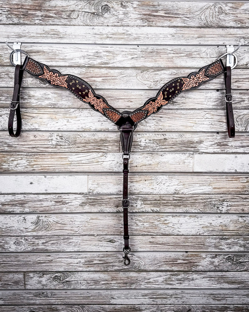 The breast collar mirrors that same detailed tooling, with wide straps that sit comfortably across the chest and adjust easily on both sides. The center chest piece pulls it all together with a clean, confident shape that shows off both form and function. Whether you're hitting the trail or turning and burning, this piece holds steady and looks dang good doing it.