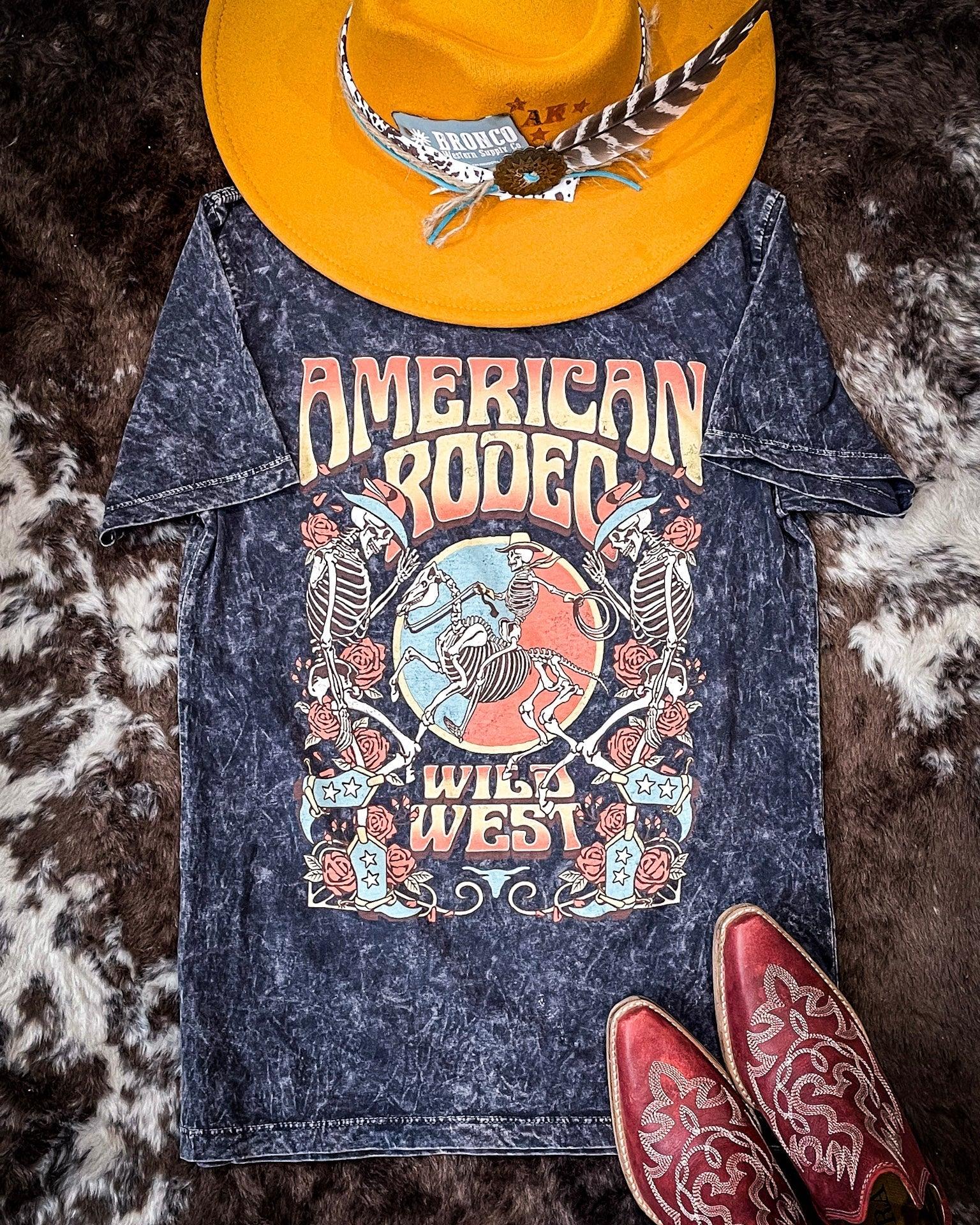 Get ready to rock the edgy American Rodeo Graphic Tee in Black with its bold mineral wash and laid-back boyfriend fit. This tee screams attitude with its unique design featuring cowboy skeletons, perfect for adding a touch of rebellion to your wardrobe. It's not just a t-shirt; it's a statement piece that blends the classic band tee aesthetic with a Western twist. This iconic piece will have you standing out from the crowd and exuding confidence wherever you go.
