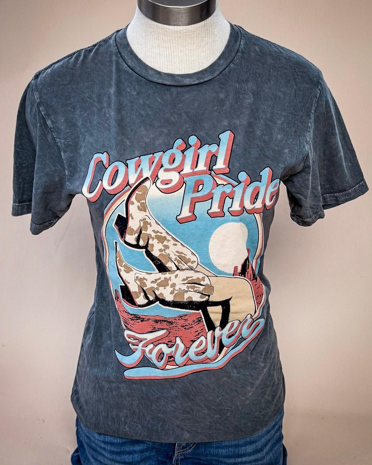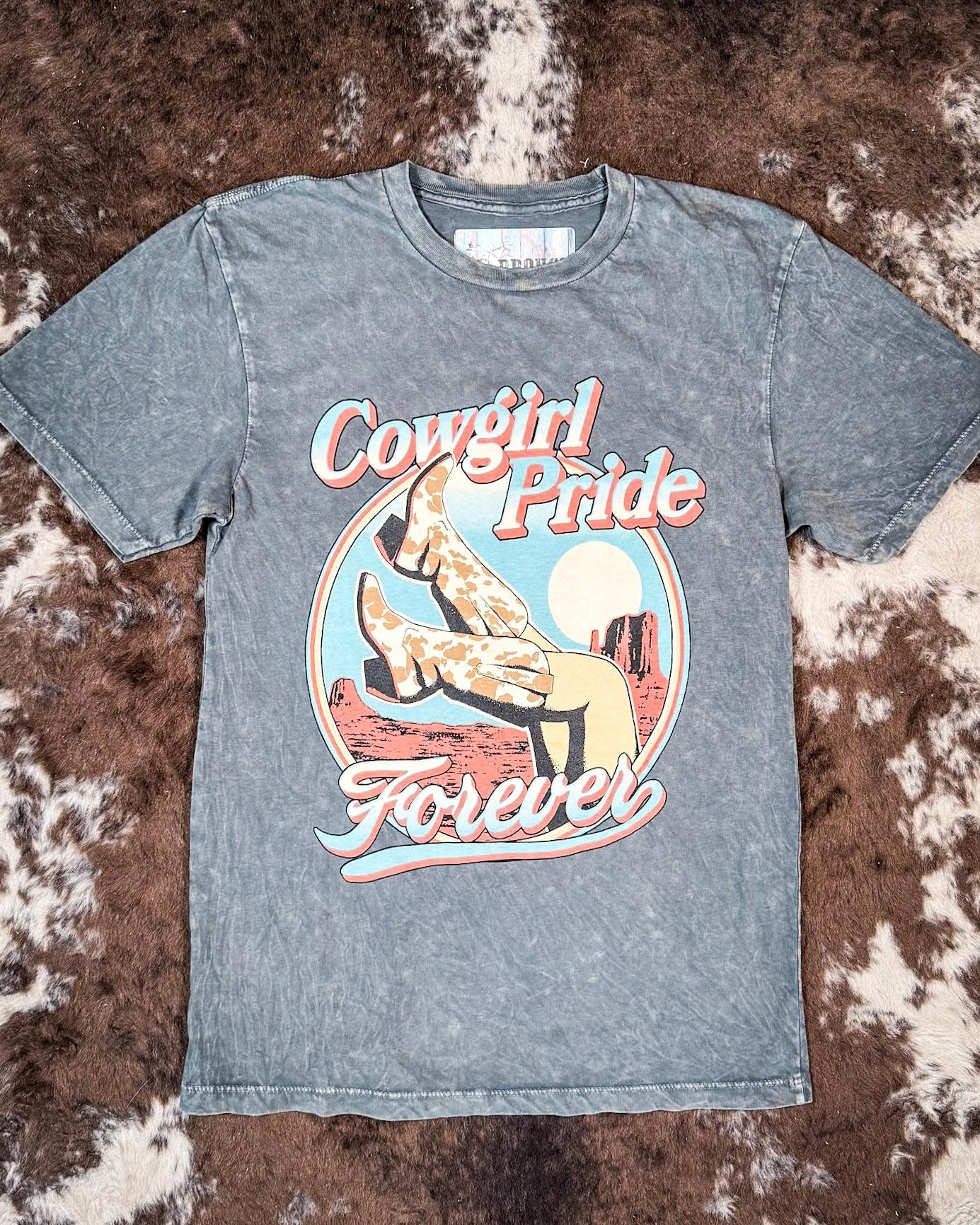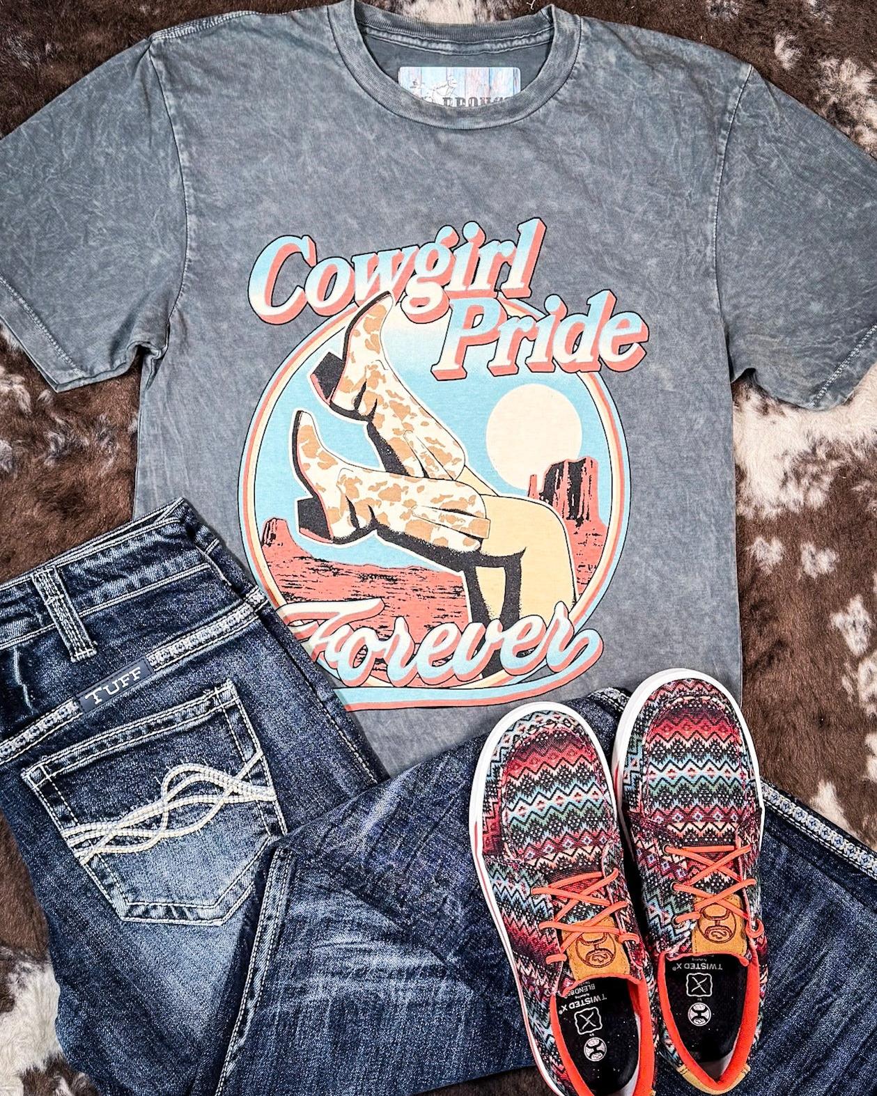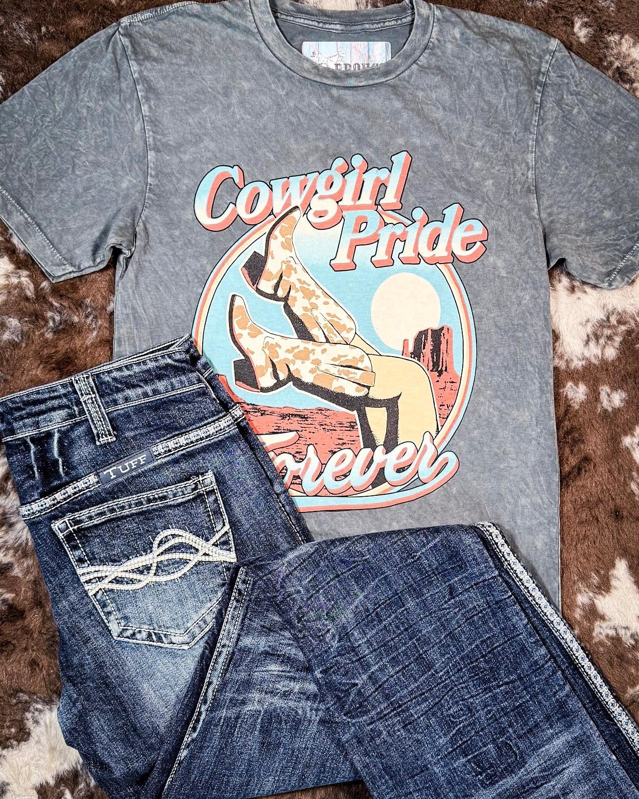 Every cowgirl needs a go-to tee that speaks to her Western soul, and the Cowgirl Pride Graphic Tee in mineral-wash gray is just that. Designed for the bold, the free-spirited, and the ones who aren't afraid to get a little dirt on their boots, this tee blends comfort with effortless Western style. Whether you're out working the ranch, heading to a rodeo, or just kicking back with friends, this shirt is ready to ride wherever the day takes you.
