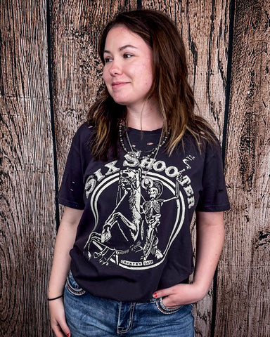 There’s bold—and then there’s Six Shooter bold. This tee rides in with outlaw energy, western grit, and the kind of lived-in feel that hits just right from the start.