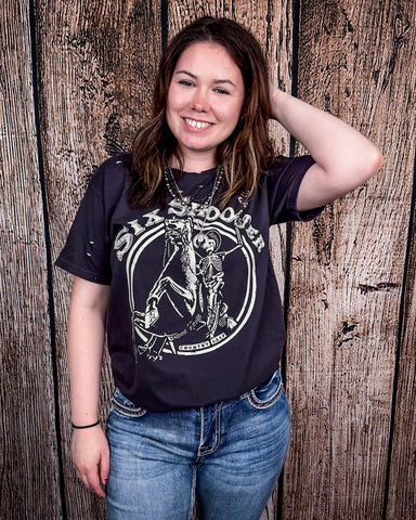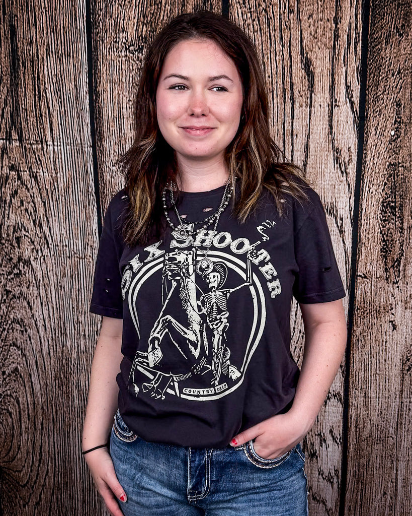 The Six Shooter Distressed Graphic Tee brings a whole lot of character to the table. Faded black cotton gives it that vintage edge, like it’s seen a few good bar fights and a few better honky tonk nights. The graphic takes center stage—a skeleton rider mid-kick on a rearing horse, framed by a retro western badge and stamped with “Six Shooter.” It’s edgy, eye-catching, and full of that no-rules, ride-til-sundown kind of spirit.