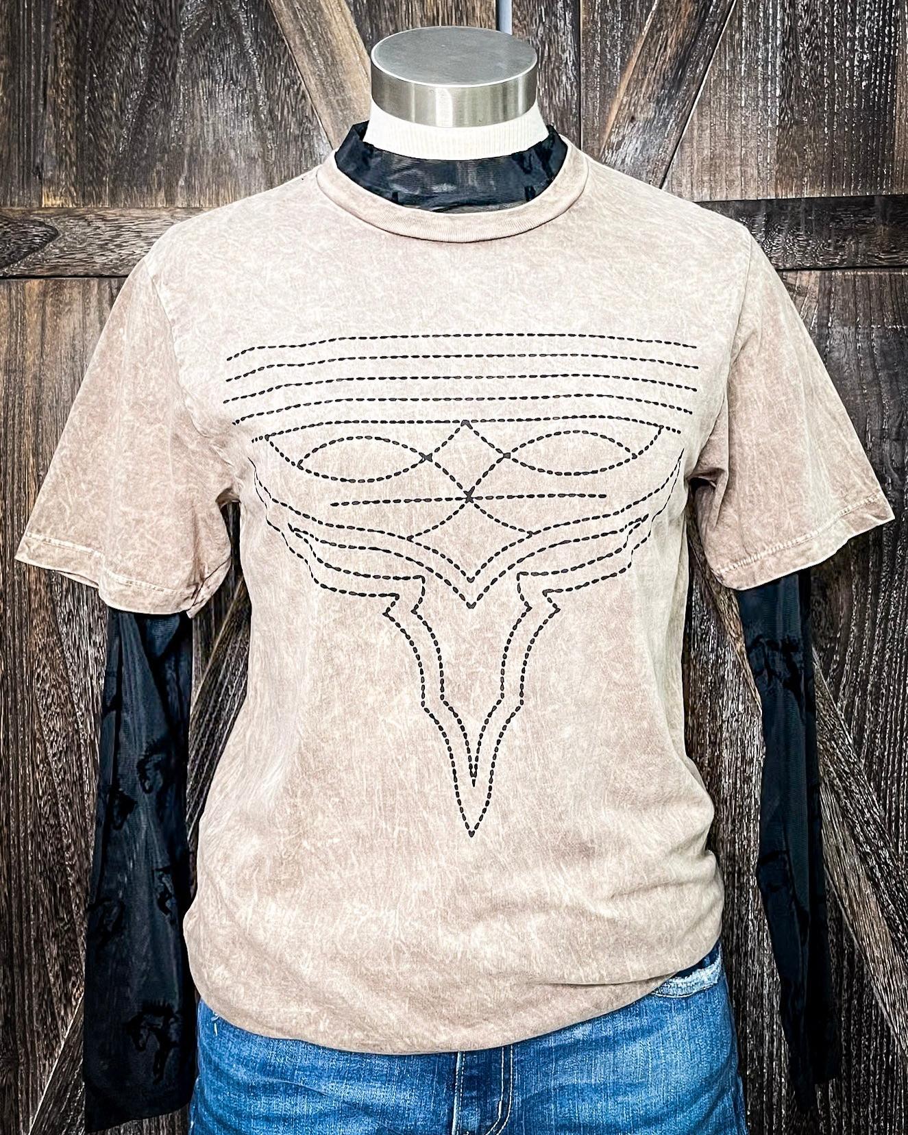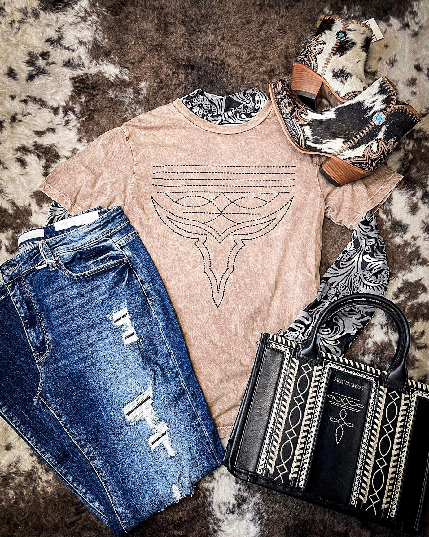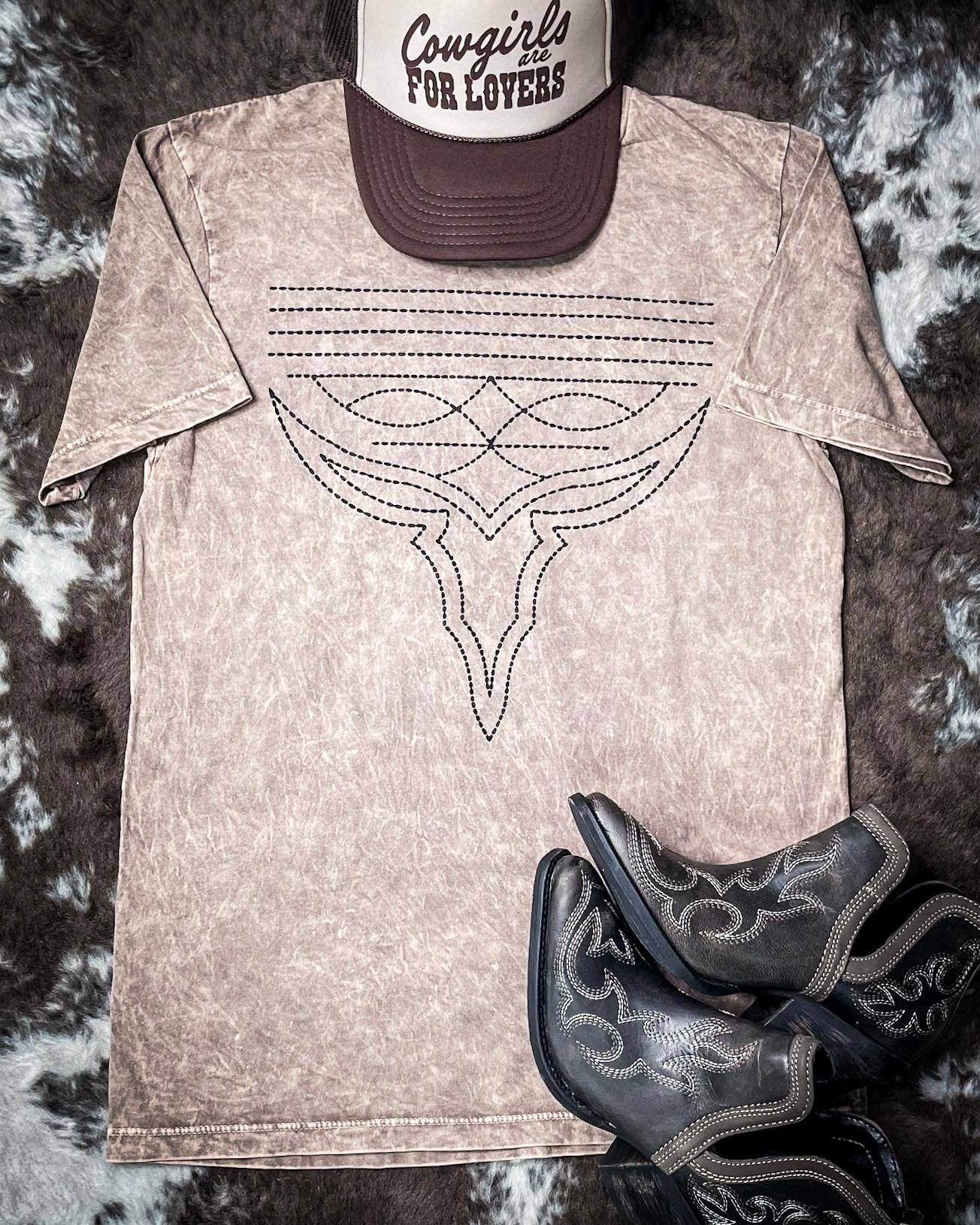 Step into rugged charm with our Western Boot Stitch Graphic Tee in Mocha. Designed for both comfort and style, this tee boasts a relaxed boyfriend fit that offers a laid-back silhouette. The warm mocha hue serves as a versatile backdrop, perfect for any wardrobe. Crafted from soft and breathable cotton, it ensures all-day comfort whether you're out on the town or lounging at home. The standout feature is the intricate graphic of Western boot stitch detailing, adding a touch of frontier-inspired flair. Pair it with your favorite jeans or layer it under a denim jacket for a timeless ensemble that celebrates the spirit of the Wild West. Embrace effortless style with a tee that's as comfortable as it is stylish.