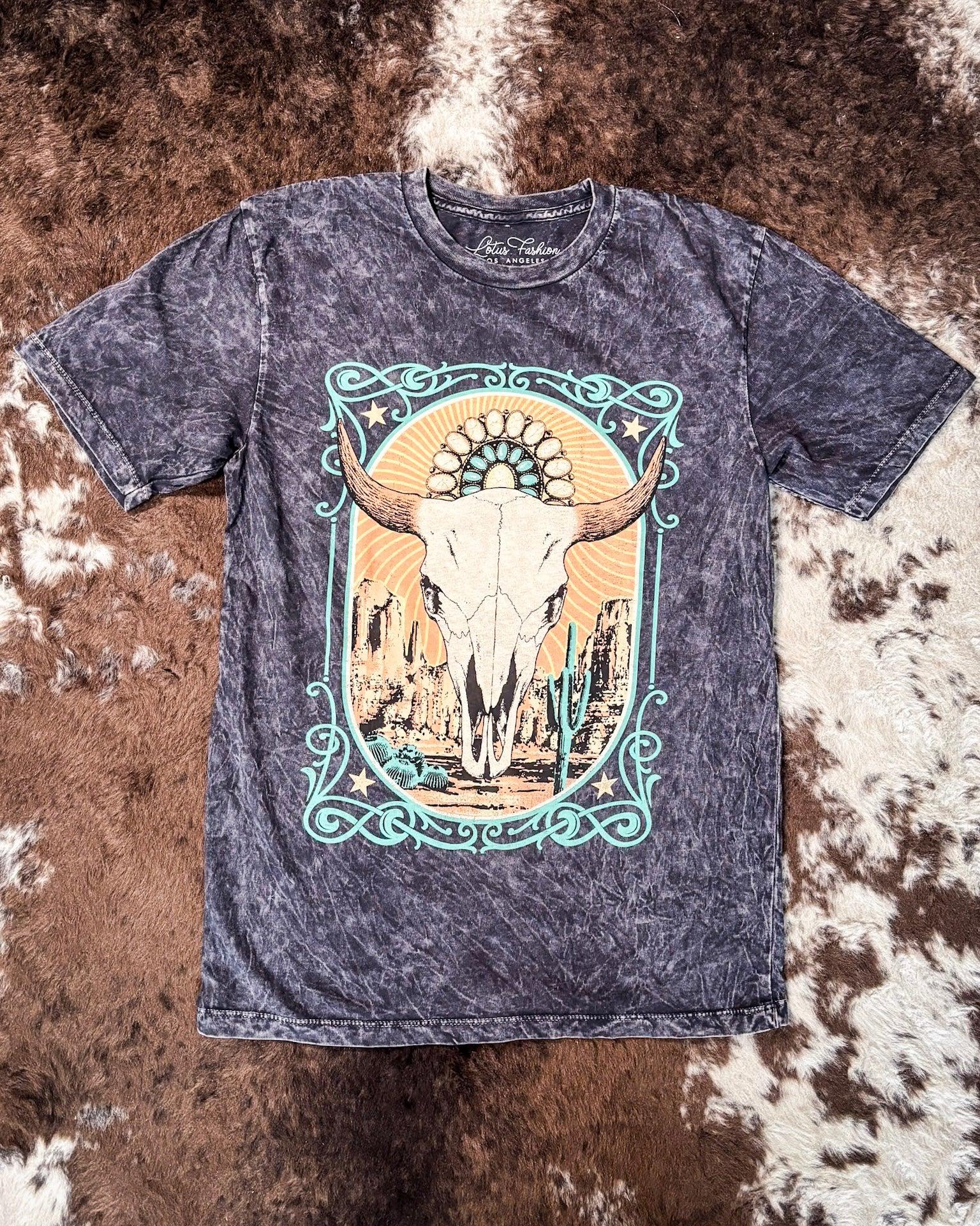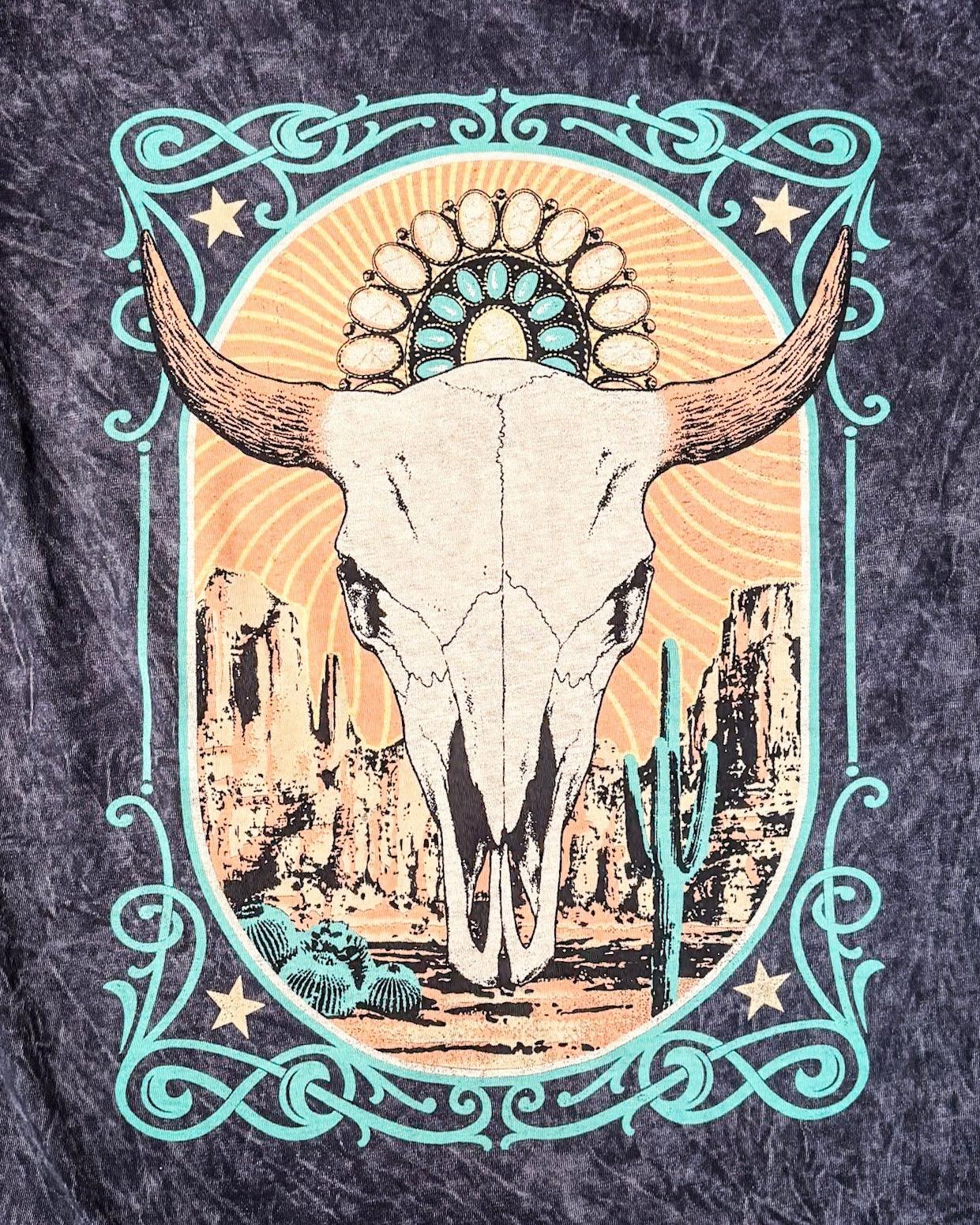 The Western Cow Skull Graphic Tee in vintage black captures the rugged beauty of the Southwest. Featuring a striking cow skull design set against a desert backdrop, this tee embodies classic western charm. A vibrant turquoise concho detail adds a bold pop of color, making this piece truly stand out. Crafted with a soft, worn-in feel, it’s perfect for pairing with your favorite denim for a timeless western-inspired look. Whether you're exploring the great outdoors or enjoying a casual day out, this tee is a must-have for those who love the spirit of the wild.