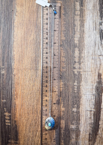 At the center of the pendant is a genuine turquoise stone—each one hand-selected for its natural variation in color and veining. The oval shape sits inside a sunburst-style design that radiates outward with delicate hand-stamped lines and scalloped edgework. It’s a symbol of strength and light, capturing the spirit of wide-open spaces and heritage craft.