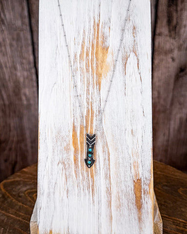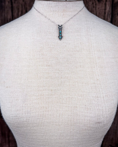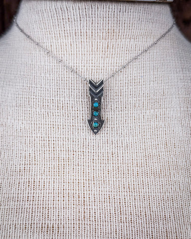 The pendant is crafted in the shape of an arrowhead, a design that’s long been worn as a symbol of strength and guidance. Clean lines and hand-stamped details give the silver a raw, organic feel—nothing polished or perfect, just real. Three small turquoise stones run down the center of the arrowhead, each one natural and unique, adding a pop of earthy color and meaning.