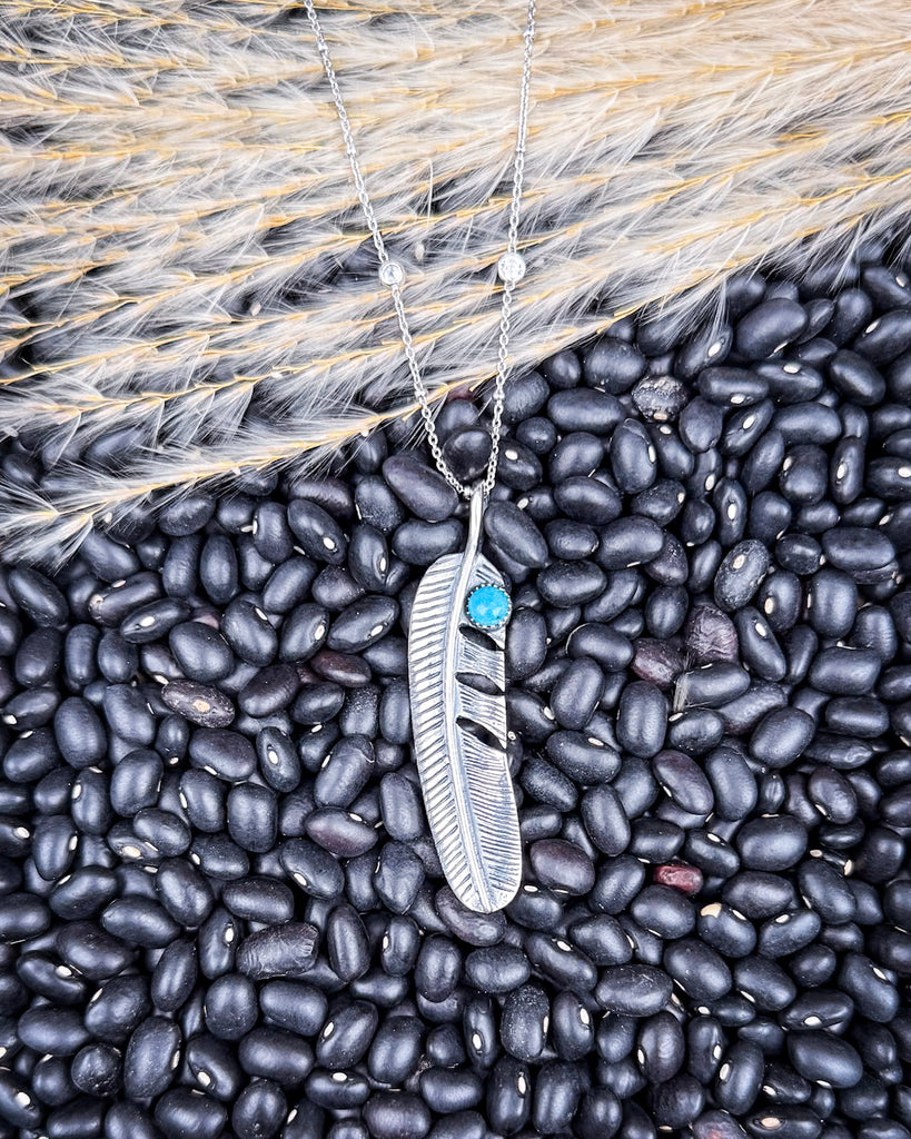 The centerpiece of the Tamia necklace is a detailed feather pendant, crafted from solid sterling silver. Every line is hand-etched, giving it a natural, textured look that captures the soft curve and flow of a real feather. At the base of the quill sits a single round turquoise stone—small but bold, and full of that signature blue-green vibrance that only comes from genuine stone.