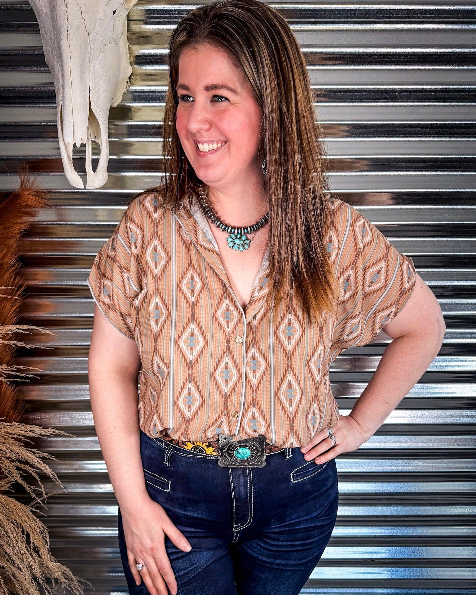 A little rugged, a little refined—the Josie Khaki Aztec Dolman Short Sleeve Button Down Top is Western charm wrapped in effortless style. With its earthy khaki base and a striking dusty blue and rust Aztec print, this top is made for the free-spirited cowgirl who loves timeless style with a touch of adventure.