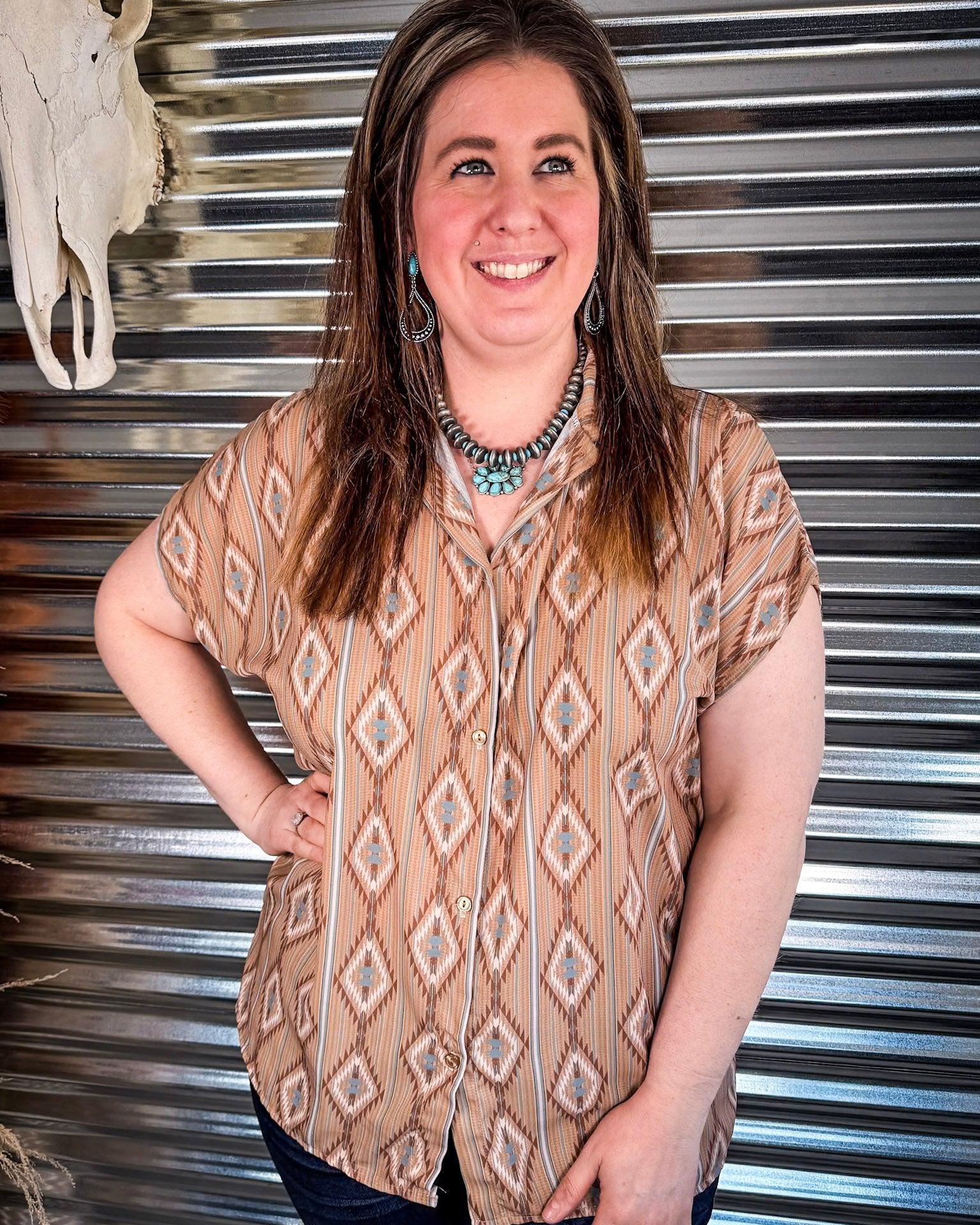 The classic button-down front adds versatility—wear it closed for a polished look or leave it open over a tank for a more laid-back vibe. The Western-inspired Aztec print gives it that rugged edge, making it a perfect match for your favorite denim and boots. Tuck it in for a refined touch or wear it loose for an effortless, breezy feel.