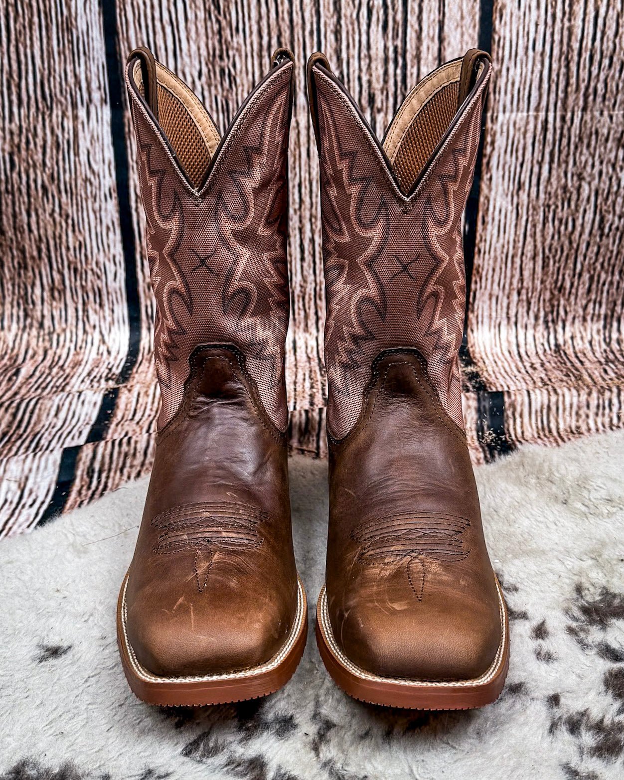 Strong, classic, and made to move—the Sandi brings a fresh take on a western staple with comfort that keeps up. With its rich brown leather vamp and tobacco-toned shaft, this boot blends everyday grit with a modern silhouette that feels right at home from the saddle to the sidewalk.
