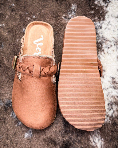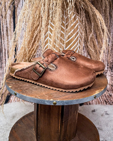 The faux suede upper in a warm tan shade gives the Iris a rich, earthy look that pairs beautifully with denim, leggings, or even your favorite knit dress. A braided strap with buckle detail adds just the right amount of rustic charm, making it a shoe that can lean casual or a little dressy depending on how you style it.