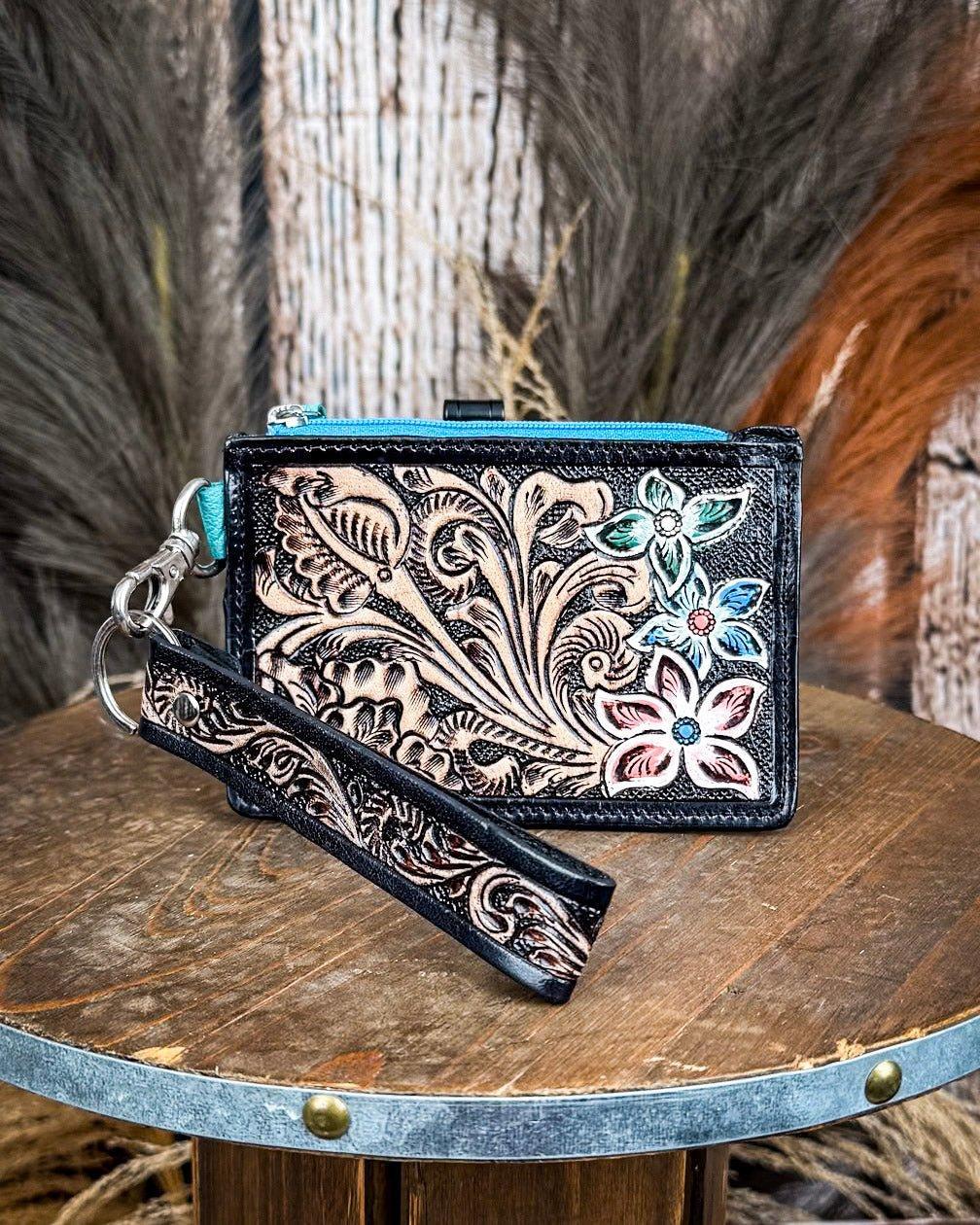 The front of the wallet features intricate, hand-carved floral patterns, each petal and leaf etched with care into premium black leather. Accented with hand-painted prickly pear cactus blossoms in turquoise, teal, and blush pink, the wallet is a perfect tribute to the untamed Southwest. The colorful design pops against the rich black leather backdrop, while the vibrant turquoise zipper adds an extra splash of personality.