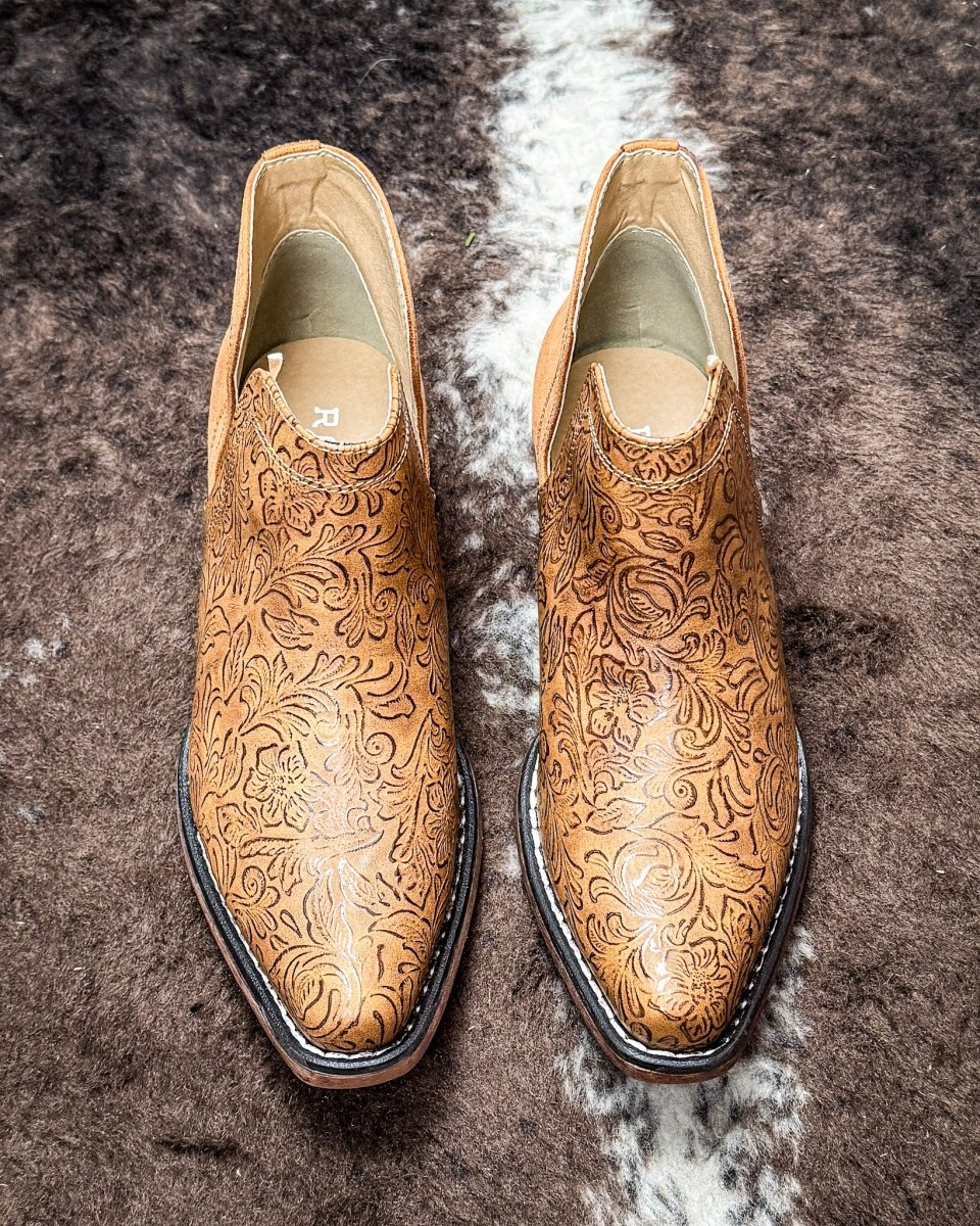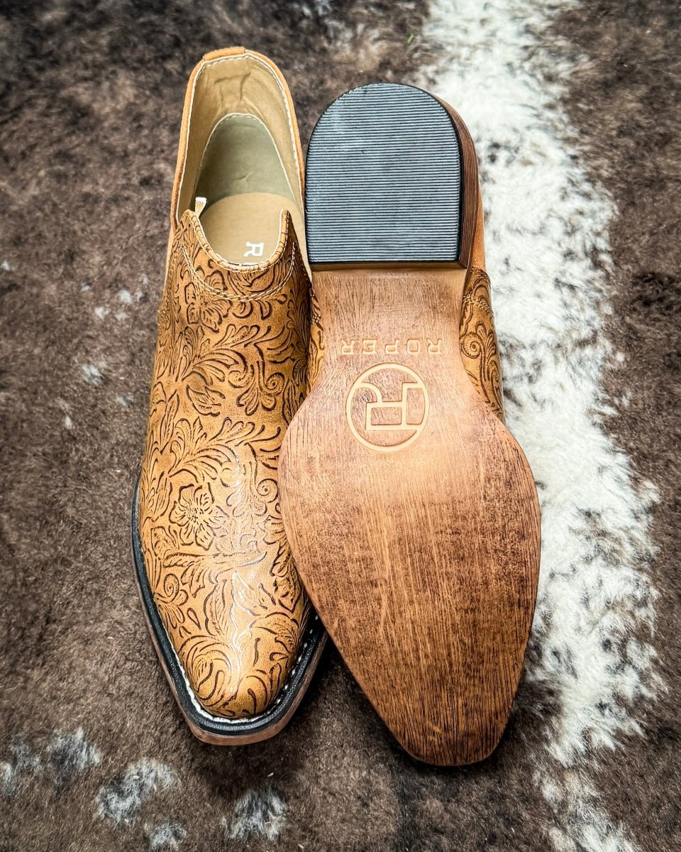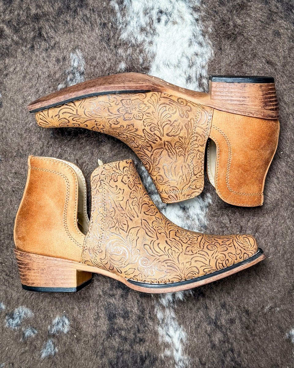 The Ava Embossed Booties in Tan by Roper bring a softer side of western style with a beautiful floral-embossed vamp and sleek faux leather heel. This easygoing ankle boot blends vintage-inspired detail with total comfort, thanks to a cushioned insole and flexible TPR outsole. The 1.5" heel gives just the right lift for daily wear, while the pull-on fit and classic silhouette make styling a breeze. Feminine, timeless, and effortlessly versatile—these booties were made for the ones who love the little details.