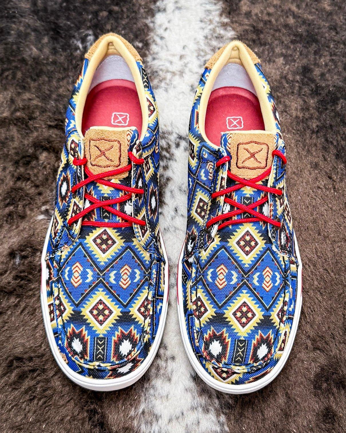 Step into bold expression with the Desert Drift Twisted X Kicks - Blue Multi Aztec, a vibrant fusion of comfort, sustainability, and unmistakable Southwestern style. Designed for the modern woman with a love for tradition and a flair for adventure, these casual kicks bring rich color, bold patterns, and rugged character into every step.